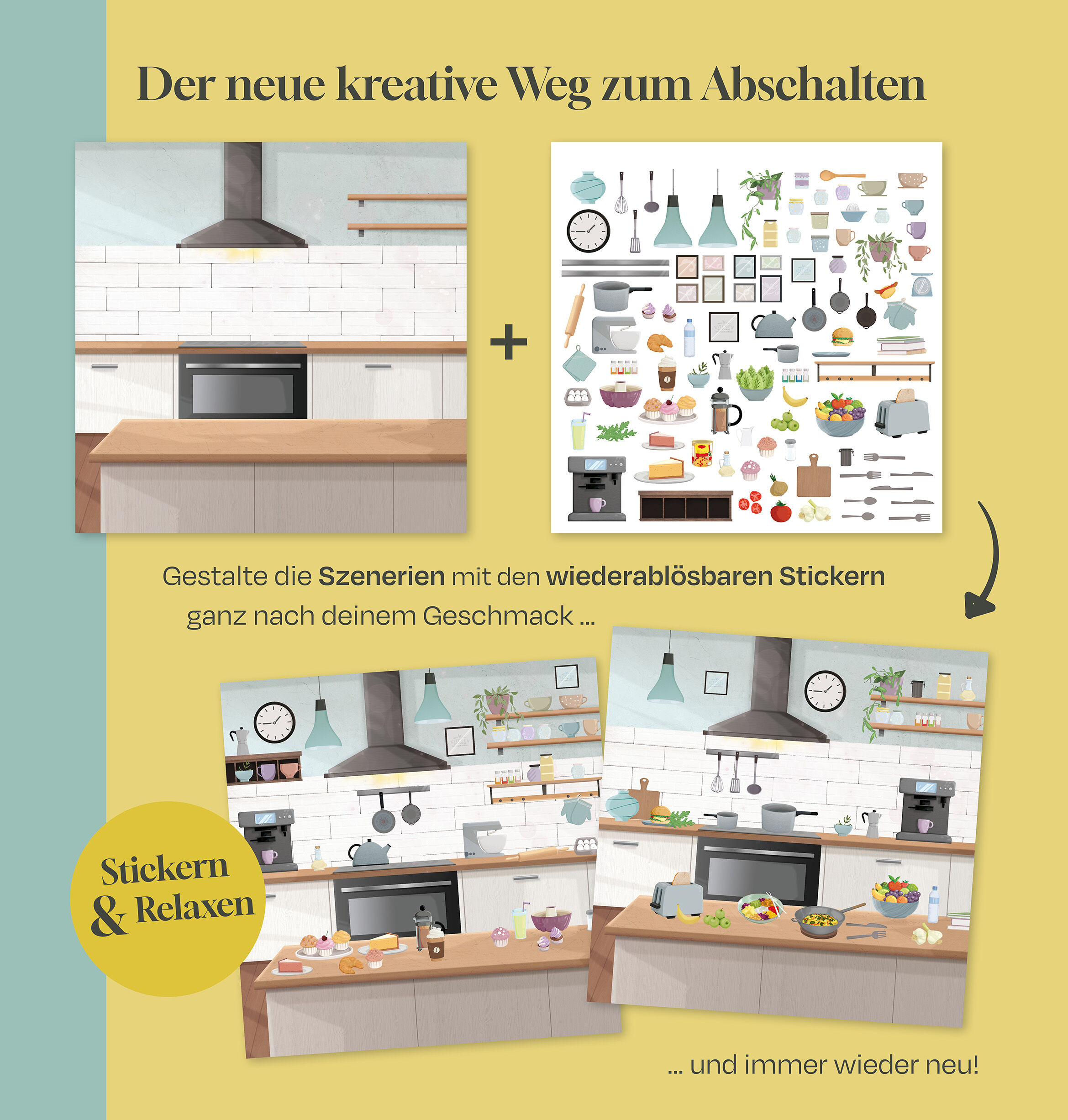 Der neue kreative Weg zum Abschalten • 10 zauberhafte Szenerien : Küche, Wohnzimmer, Schminktisch, Kleiderschrank, Gemüsegarten, Blumengarten, winterlicher Garten, Teich, Terrasse und Balkon - zum kreativen Gestalten mit Stickern • Mit über 500 Stic...