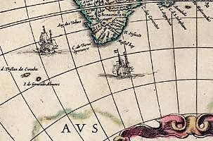 Farbenprächtiger Nachdruck, Lieferung gerollt, Blattgröße (B x H) 67 x 48 cm, Bedrucktes Blatt (B x H) 63 x 43,5 cm. Origilalmaßstab ca. 1:92 000 000 - aber die Darstellung um 10 % vergrößert zum Original. Kartographen: Henricus Hondius (15971651) und Johann J...