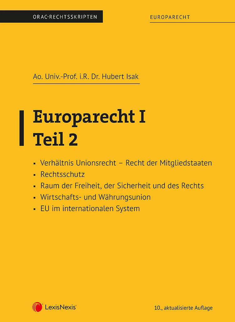 Das Skriptum Europarecht I Teil 2 behandelt in seiner bereits 10. Auflage gewohnt übersichtlich und verständlich aufbereitet das Verhältnis des Unionsrechts zum Recht der Mitgliedstaaten , den Rechtsschutz und Grundrechtsschutz und den Raum der Freiheit , der...Das Skriptum Europarecht I **** Teil 2 behandelt in seiner bereits 10. Auflage gewohnt übersichtlich und verständlich aufbereitet das Verhältnis des Unionsrechts zum Recht der Mitgliedstaaten , den Rechtsschutz und Grundrechtsschutz und den Raum der Freiheit , der Sicherheit, des Rechts der Union, die Wirtschafts- und Währungsunion und die Stellung der EU im internationalen System .