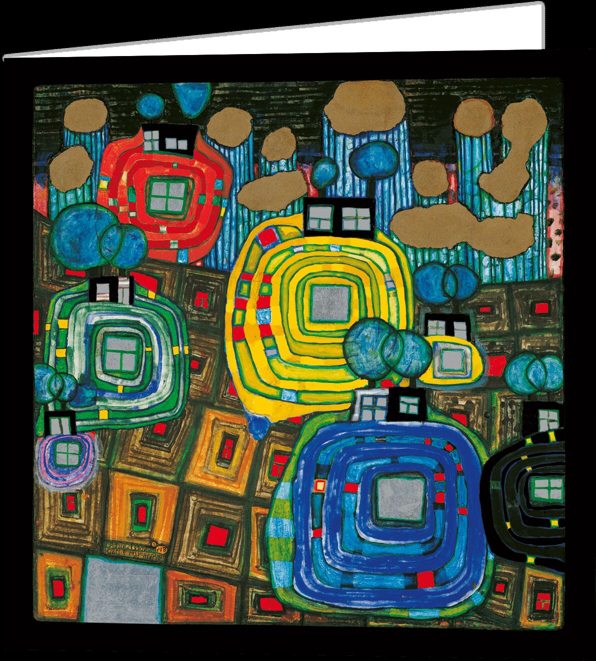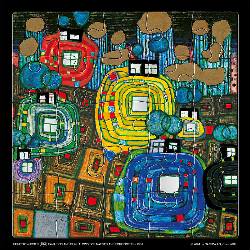 Motiv: Hundertwasser 814 - PAVILIONS AND BUNGALOWS - FOR NATIVES AND FOREIGNERS Bestandteile: Puzzle, Grußkarte, Briefumschlag Format: 15,5 x 15,5 cm Veredelung: Puzzleteile mit silberner Glanzfolienprägung Hersteller: Wörner Verlag GmbH, Borsigstr. 7, D-71277...