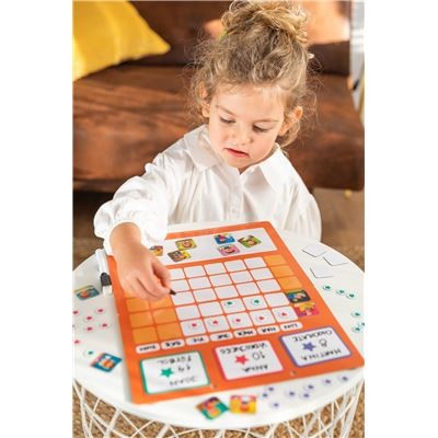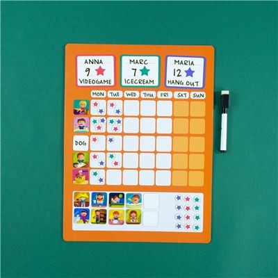 Eine Belohnungstafel, die das Kind motivieren soll, seine wöchentlichen Aufgaben zu erfüllen und sein Verhalten zu verbessern. Es kann mit bis zu 3 verschiedenen Kindern gespielt und personalisiert werden.