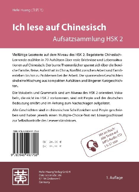 Lesetexte auf dem Niveau des HSK 2: In dem Buch sind Erzählungen realer Erlebnisse und Lebenssituationen begeisterter Chinesisch-Lernender gesammelt. Die chinesischen Texte sind am HSK 2 orientiert, wobei Vokabeln, die nicht im HSK 2 vorkommen, mit Pinyin und ...