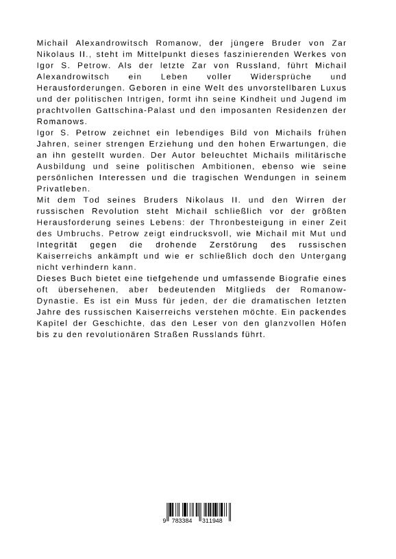 Michail Alexandrowitsch Romanow, der jüngere Bruder von Zar Nikolaus II., steht im Mittelpunkt dieses faszinierenden Werkes von Igor S. Petrow. Als der letzte Zar von Russland, führt Michail Alexandrowitsch ein Leben voller Widersprüche und Herausforderungen. ...