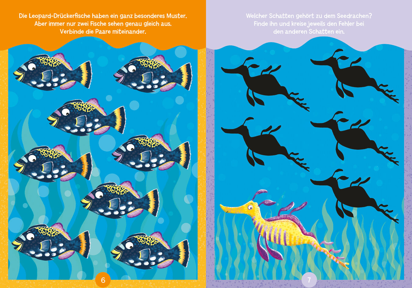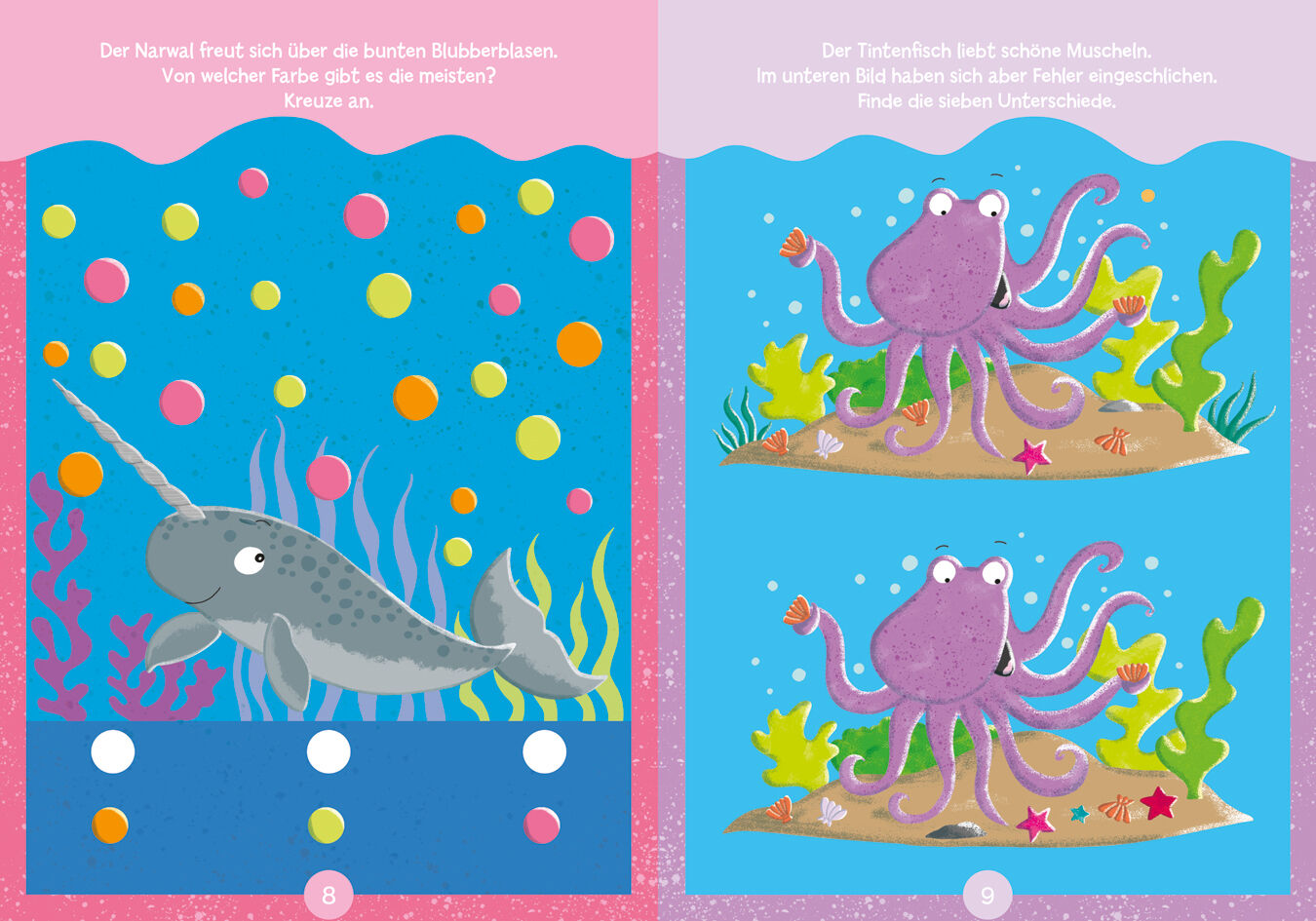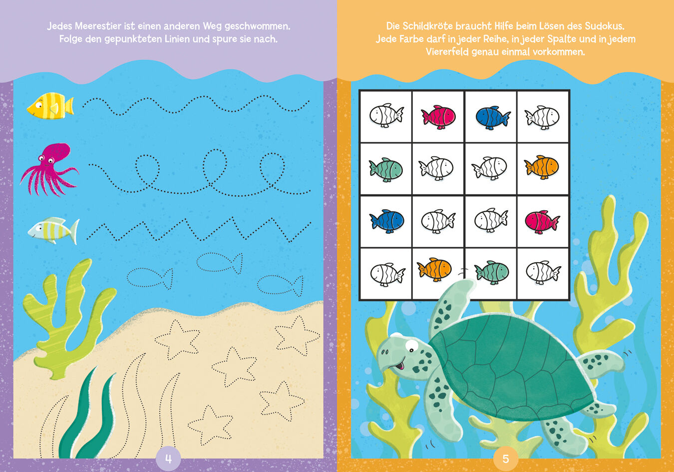 Bunter Rätselspaß für kleine Meeres-Fans. Mit liebevollen Illustrationen bunter Unterwasser-Tiere tauchen Kinder ab 4 Jahren ein in die Welt der Rätsel. Labyrinthe, Sudokus, Paare finden, Unterschiede erkennen: Hier wird gerätselt, gemalt und gezählt. Eine tol...