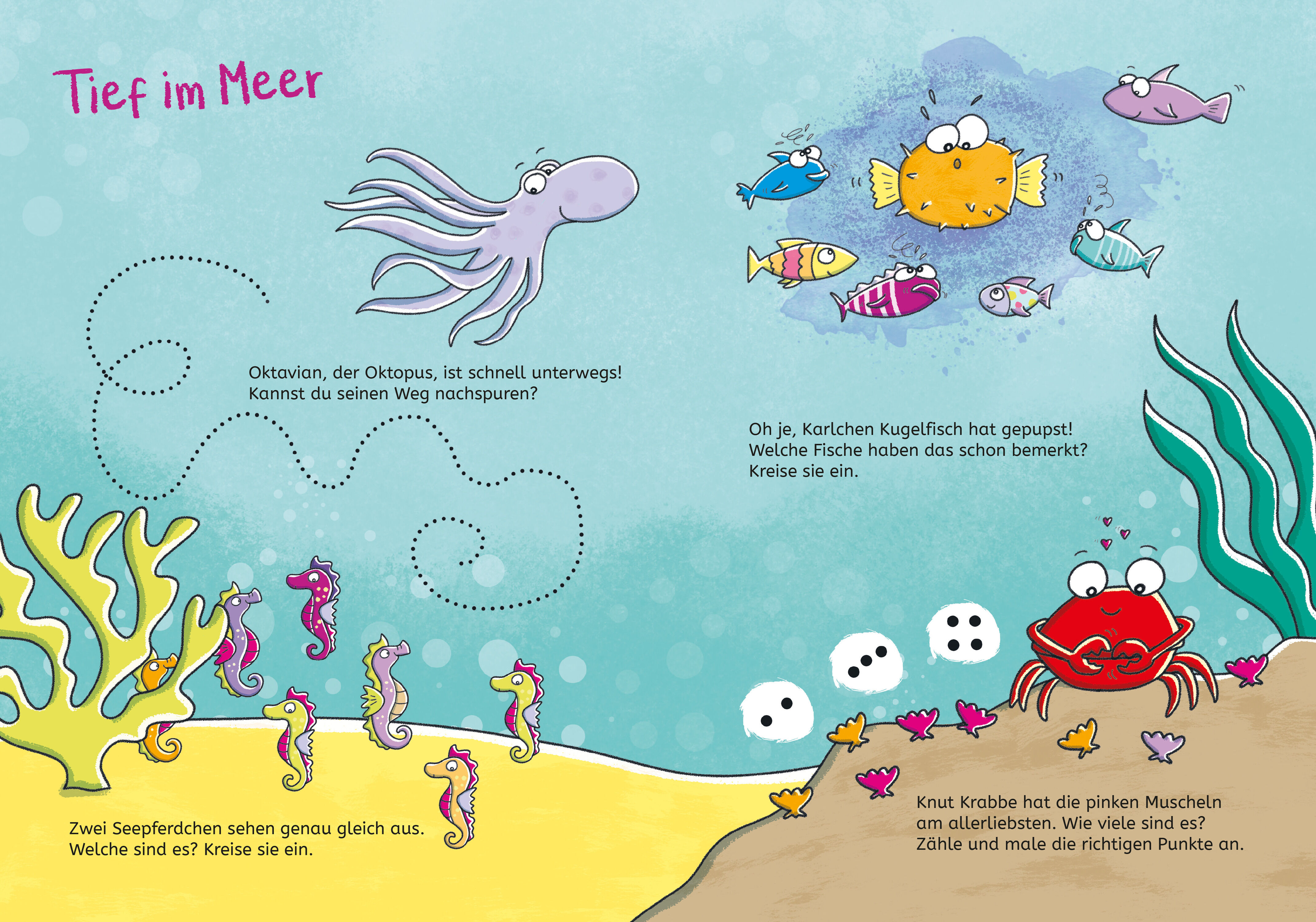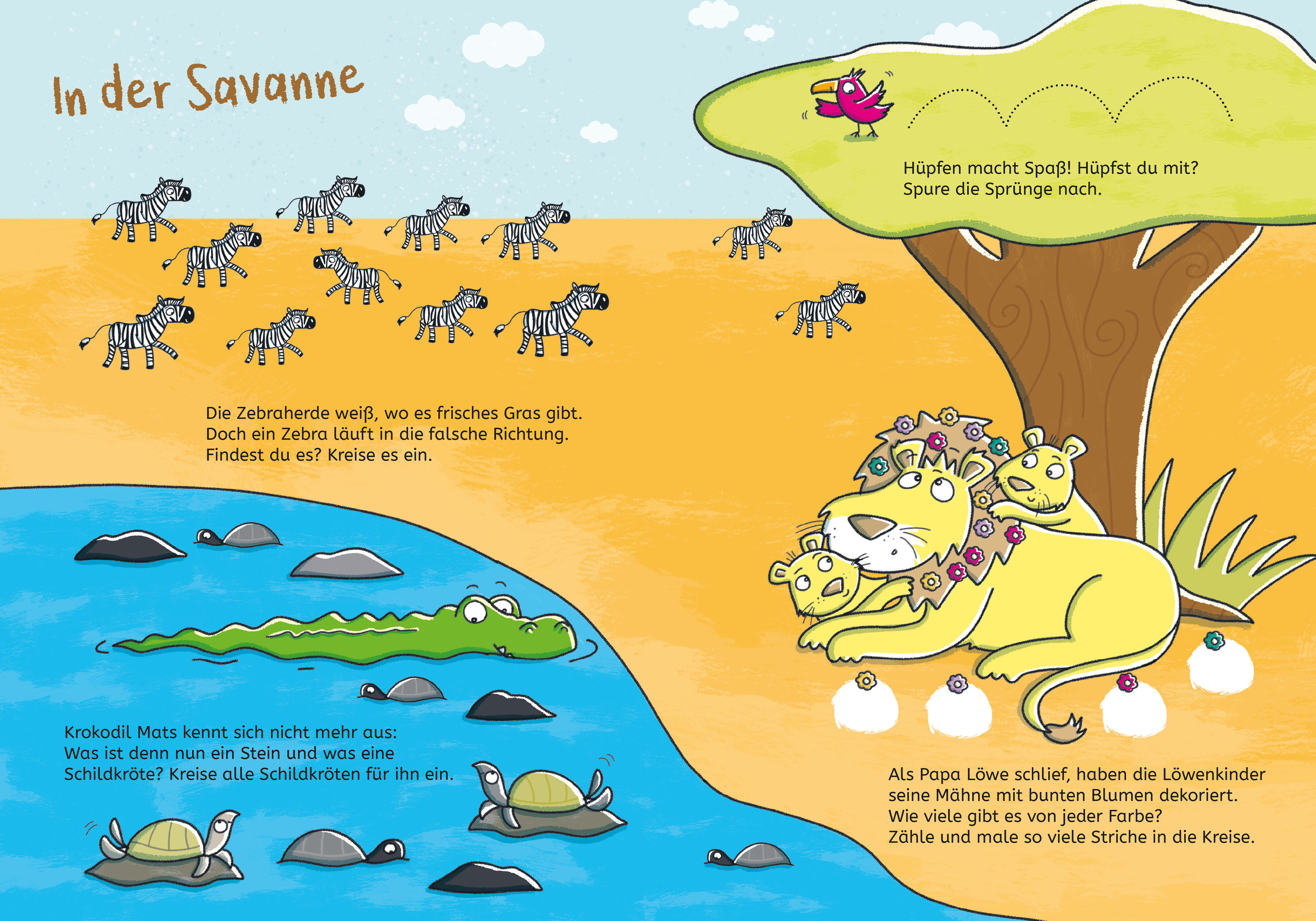 Das bunte Rätselheft nimmt Kindergartenkinder mit in die Welt der Tiere. In die witzigen, farbenfrohen Szenen sind verschiedene Rätsel für Kindergartenkinder eingebaut: Wie viele Blumen haben die Löwenkinder ihrem Papa in die Mähne gesteckt? Welches Zebra läuf...