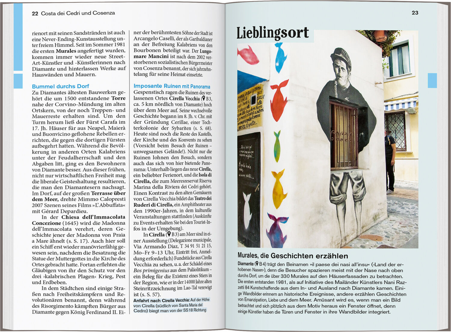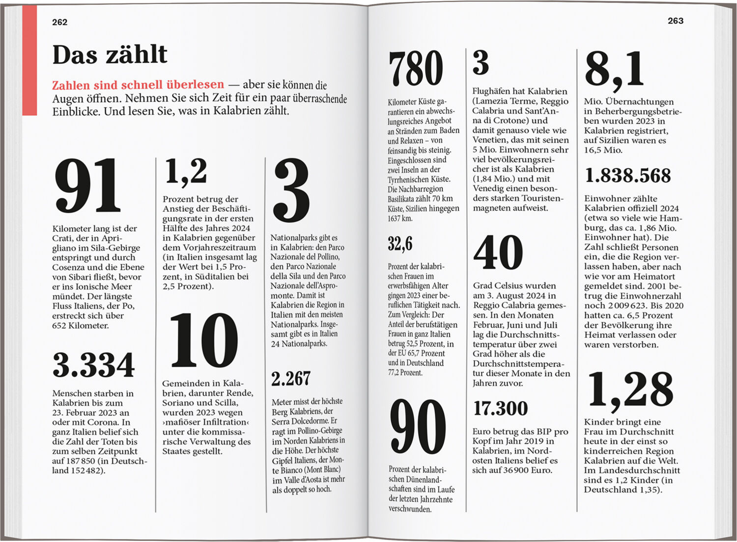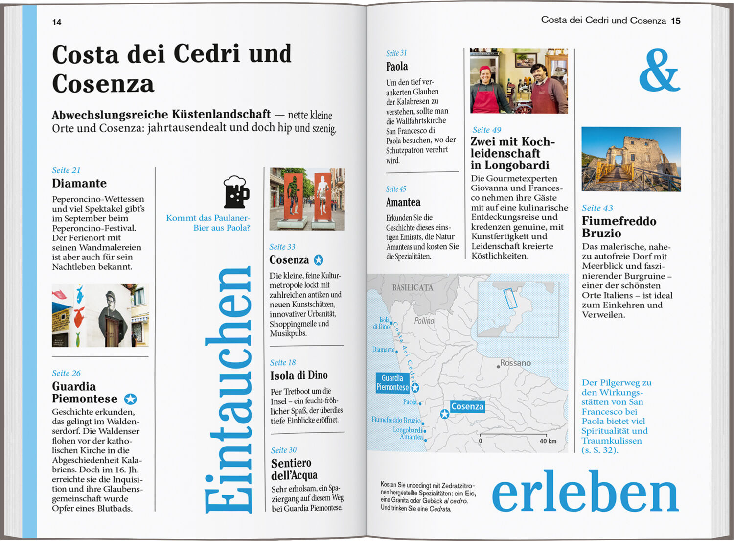 Senkrechtstarter, Überflieger, Querfeldein. Vor Ort die Kapitel: Costa dei Cedri und Cosenza, Pollino und der Golf von Corigliano, Sila und albanische Dörfer, Crotone, Catanzaro und Golf von Squillace, Vom Tyrrhenischen zum Ionischen Meer…