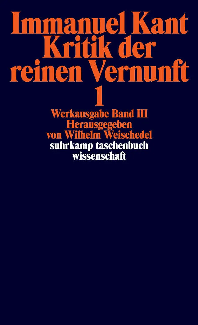 Zueignung Vorrede zur ersten Auflage Vorrede zur zweiten Auflage Inhaltsverzeichnis der ersten Auflage Einleitung I. Von dem Unterschiede der reinen und empirischen Erkenntnis / II. Wir sind im Besitze gewisser Erkenntnisse a priori, und selbst der gemeine Ver...Zueignung Vorrede zur ersten Auflage Vorrede zur zweiten Auflage Inhaltsverzeichnis der ersten Auflage Einleitung I. Von dem Unterschiede der reinen und empirischen Erkenntnis / II. Wir sind im Besitze gewisser Erkenntnisse a priori, und selbst der gemeine Verstand ist niemals ohne solche / III. Die Philosophie bedarf einer Wissenschaft, welche die Möglichkeit, die Prinzipien und den Umfang aller Erkenntnisse a priori bestimme / IV. Von dem Unterschiede analytischer und synthetischer Urteile / V. In allen theoretischen Wissenschaften der Vernunft sind synthetische Urteile a priori als Prinzipien enthalten / VI. Allgemeine Aufgabe der reinen Vernunft / VII. Idee und Einteilung einer besonderen Wissenschaft, unter dem Namen einer Kritik der reinen Vernunft I. TRANSZENDENTALE ELEMENTARLEHRE Erster Teil. Die transzendentale Ästhetik § 1 / 1. Abschnitt. Von dem Raume / § 2. Metaphysische Erörterung dieses Begriffs / § 3. Transzendentale Erörterung des Begriffs vom Raume / Schlüsse aus obigen Begriffen / 2. Abschnitt. Von der Zeit / § 4. Metaphysische Erörterung des Begriffs der Zeit / § 5. Transzendentale Erörterung des Begriffs der Zeit / § 6. Schlüsse aus diesen Begriffen / § 7. Erläuterung / § 8. Allgemeine Anmerkungen zur transzendentalen Ästhetik / Beschluß der transzendentalen Ästhetik Zweiter Teil. Die transzendentale Logik Einleitung. Idee einer transzendentalen Logik I. Von der Logik überhaupt / II. Von der transzendentalen Logik / III. Von der Einteilung der allgemeinen Logik in Analytik und Dialektik / IV. Von der Einteilung der transzendentalen Logik in die transzendentale Analytik und Dialektik Erste Abteilung. Die transzendentale Analytik Erstes Buch. Die Analytik der Begriffe 1. Hauptstück. Von dem Leitfaden der Entdeckung aller reinen Verstandesbegriffe 1. Abschnitt. Von dem logischen Verstandesgebrauche überhaupt / 2. Abschnitt. (§ 9. Von der logischen Funktion des Verstandes in Urteilen) / 3. Ab