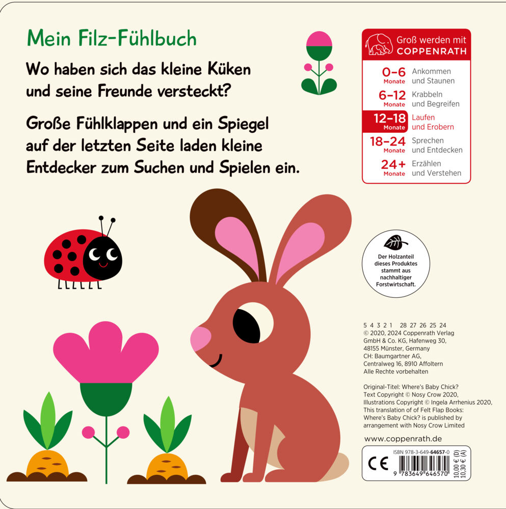 Wo haben sich das kleine Küken und seine Freunde versteckt? Große Fühlklappen und ein Spiegel auf der letzten Seite laden kleine Entdecker zum Suchen und Spielen ein.