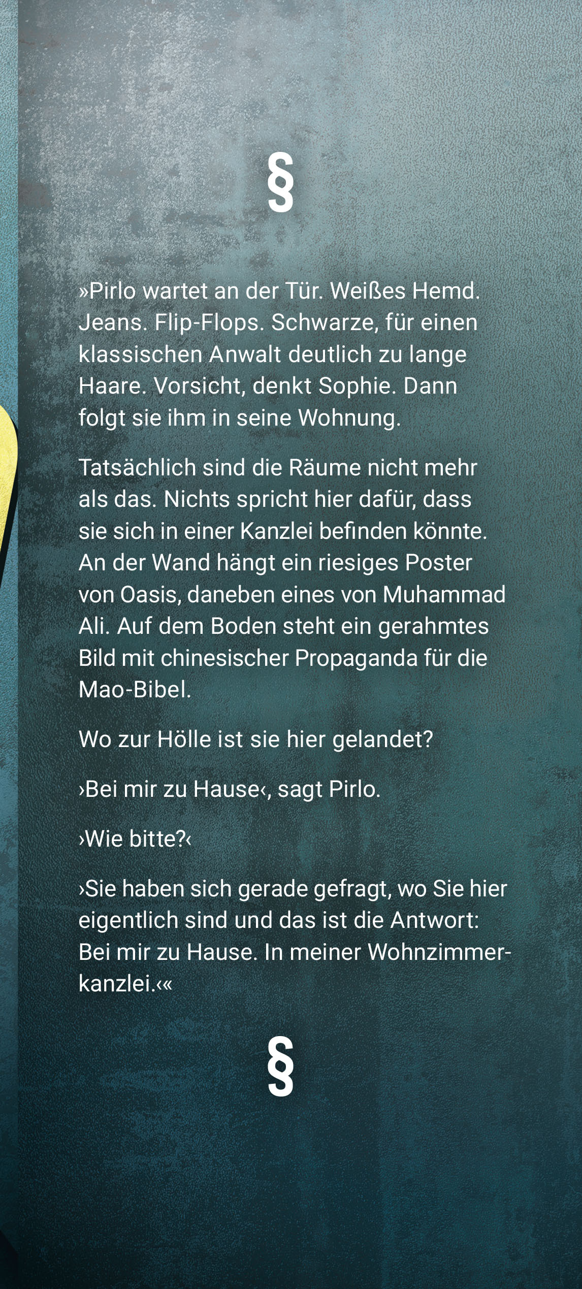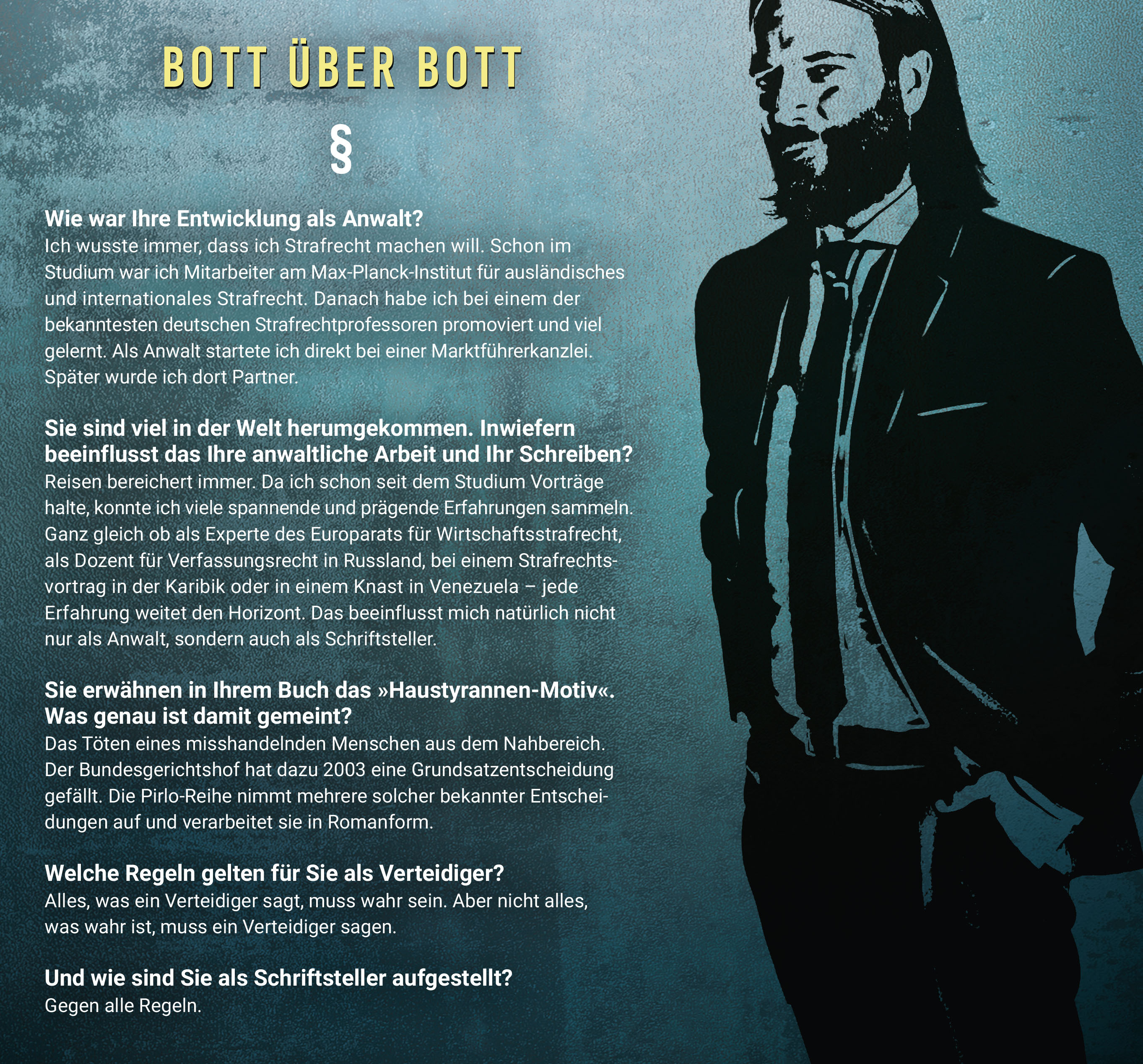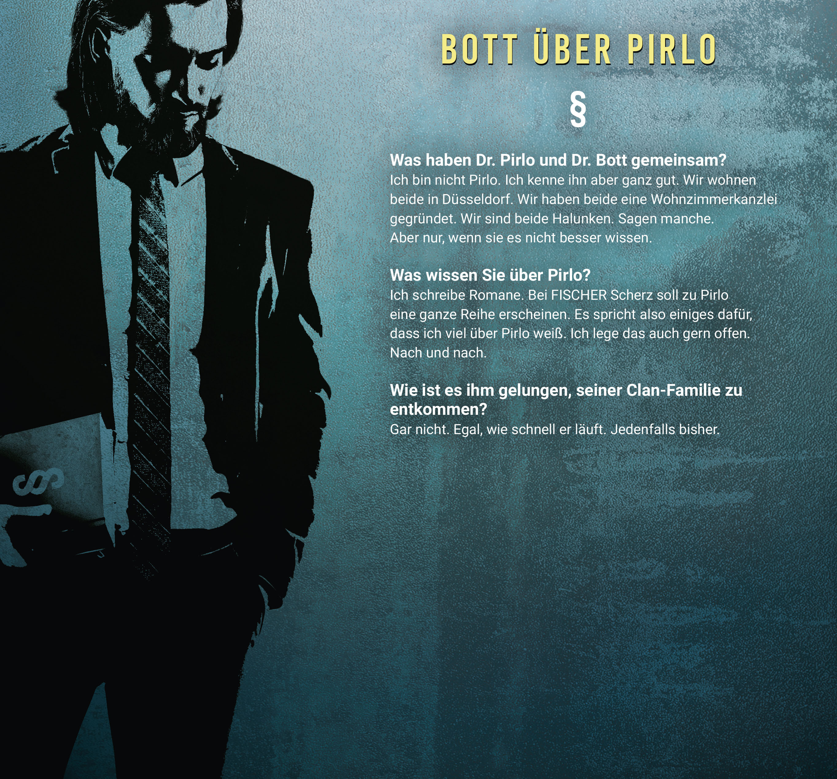 IM ZWEIFEL FÜR DEN ANGEKLAGTEN. IM ZWEIFEL GEGEN ALLE REGELN ... »Pirlo - Gegen alle Regeln« ist der Auftakt einer Serie mit Anton Pirlo und seiner Partnerin Sophie Mahler von Strafverteidiger Ingo Bott. Pirlo ist charismatisch, chaotisch und unter Druck. Ers...