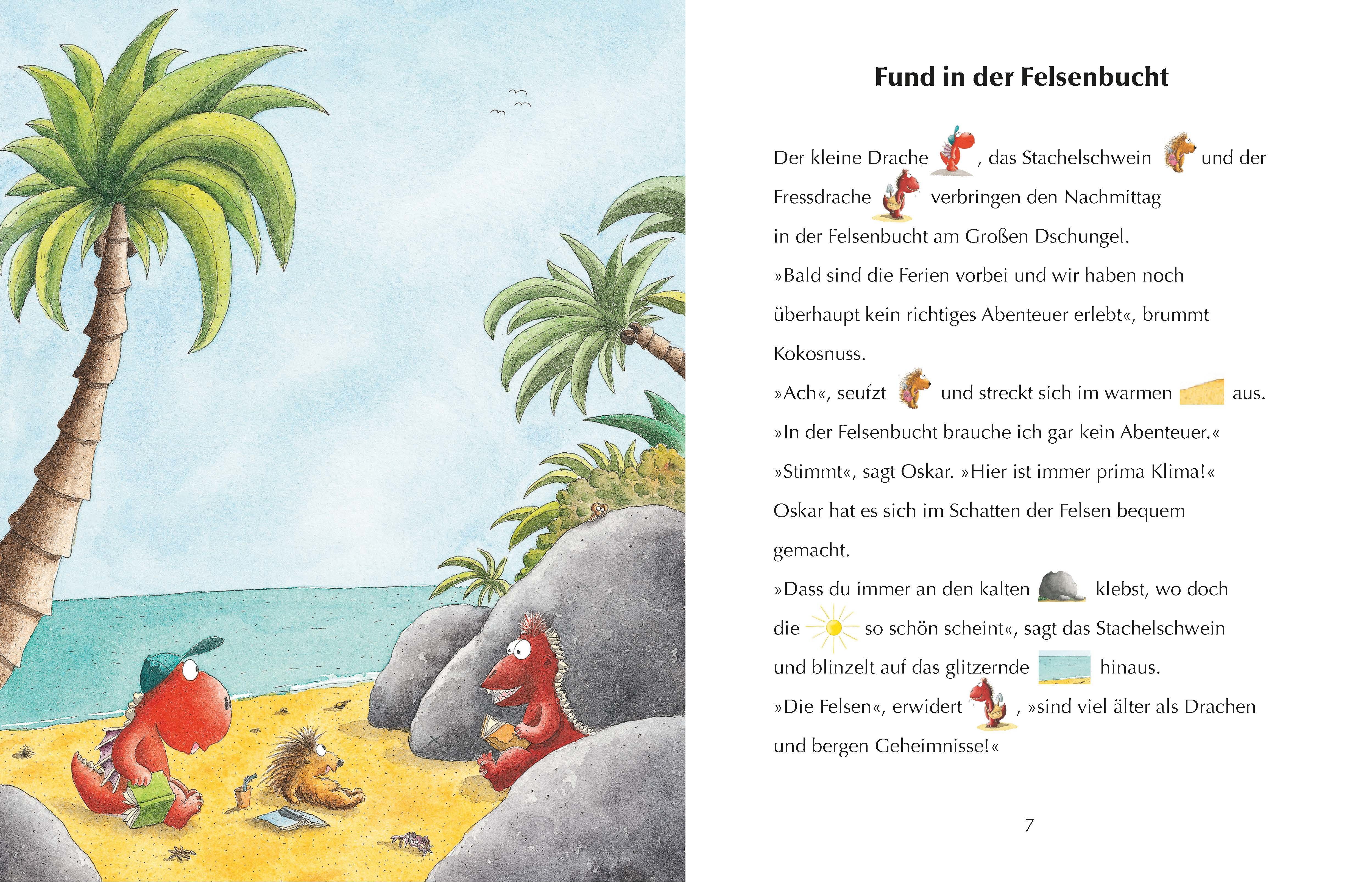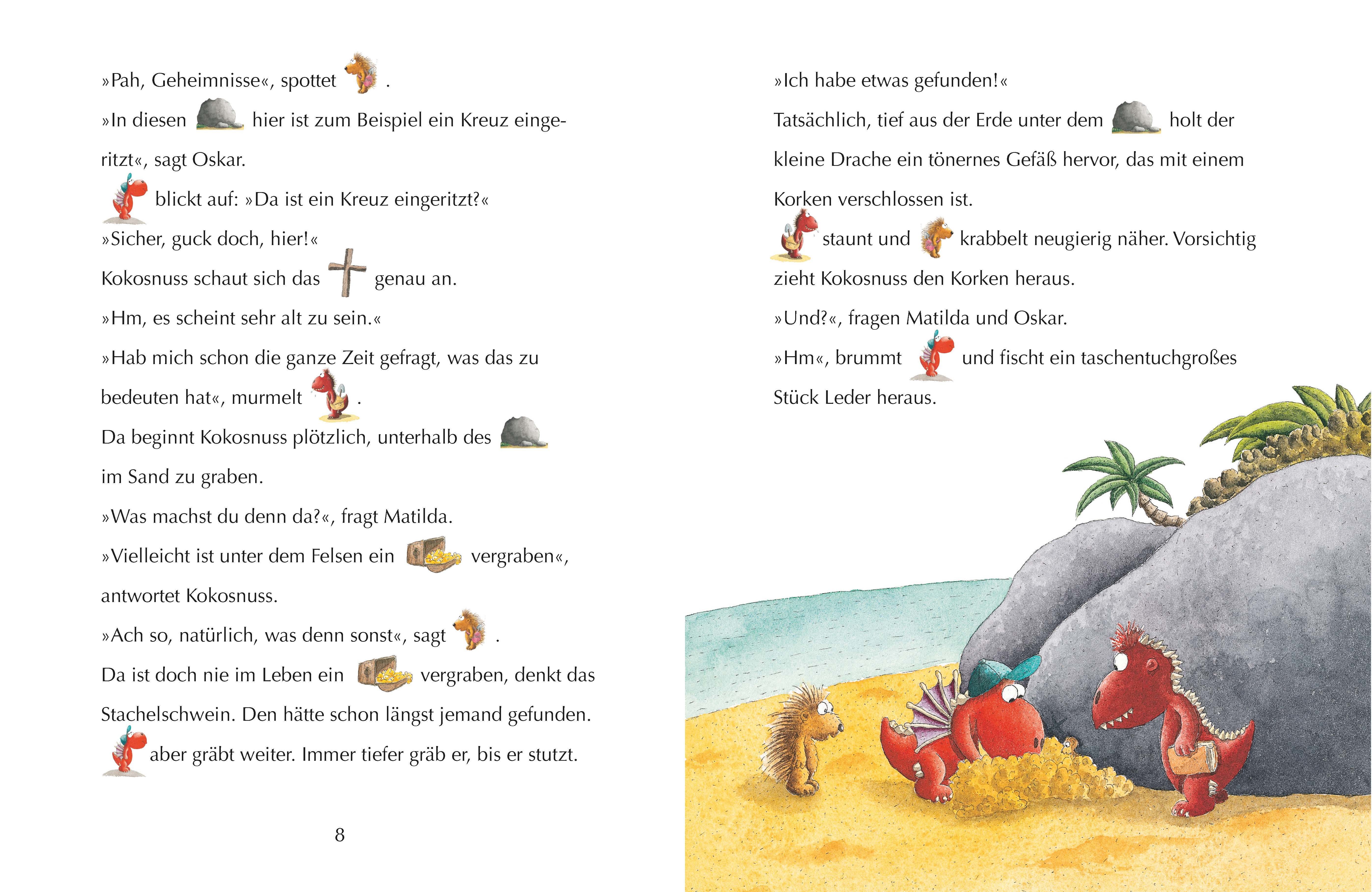 Der kleine Drache Kokosnuss, Stachelschwein Matilda und Fressdrache Oskar finden beim Spielen ein Stück Leder mit einer seltsamen Zeichnung. "Das ist sicher eine Schatzkarte!", vermuten die drei, rüsten sich sogleich für eine Schatzsucher-Expedition und ziehen...