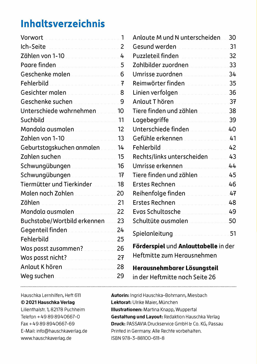 Mit diesem Hauschka-Vorschulheft werden gezielt die Fähigkeiten der Kinder im Hinblick auf die Schulreife gefördert. Es deckt unterschiedliche Lernbereiche ab, wie z.B. Konzentration, logisches Denken, Feinmotorik, Kreativität und bildliche Wahrnehmung. Die Au...