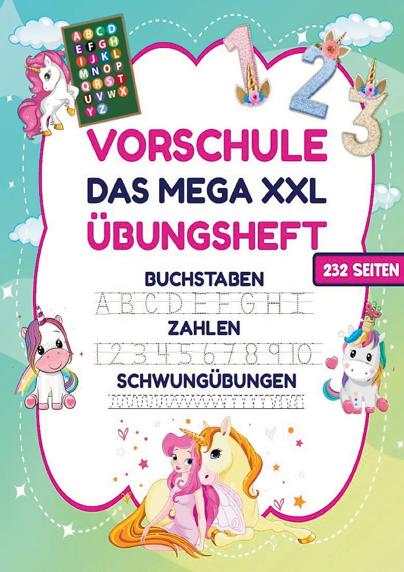 Das MEGA XXL Vorschule Übungsheft für Mädchen Spielerisch lernen mit zauberhaften Einhörnern! Dieses liebevoll gestaltete Lernheft ist die perfekte Schulvorbereitung für Mädchen ab 5 Jahren , die Einhörner lieben ! Spielerisch werden Buchstaben, Zahlen und Sc...