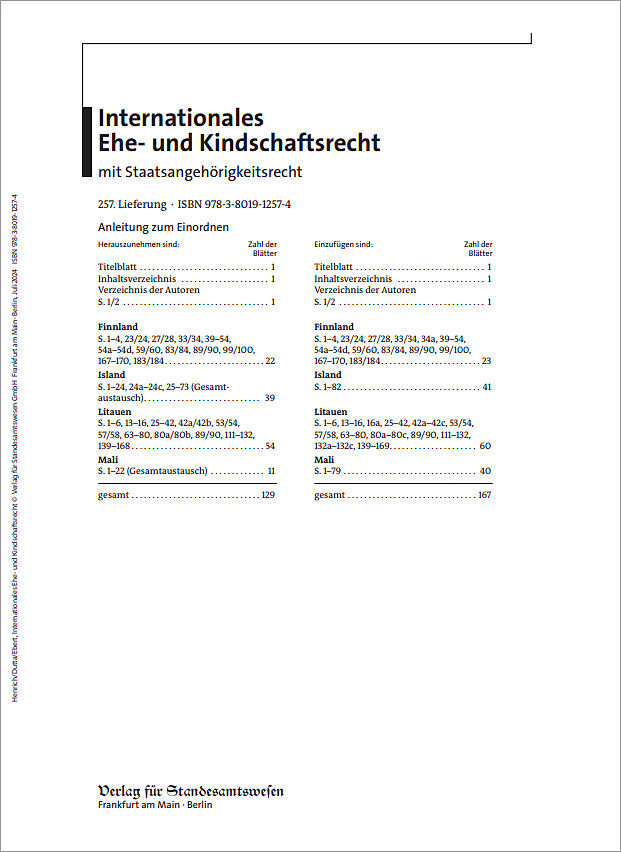 Mit der 258. Ergänzungslieferung zum »Internationalen Ehe- und Kindschaftsrecht« wird im Länderbericht zu Indien ein umfangreicher Regionalteil zu Goa ergänzt. Der Kroatien-Bericht wurde vollständig überarbeitet. Zu Lettland wird auf neuere Rechtsentwicklunge...