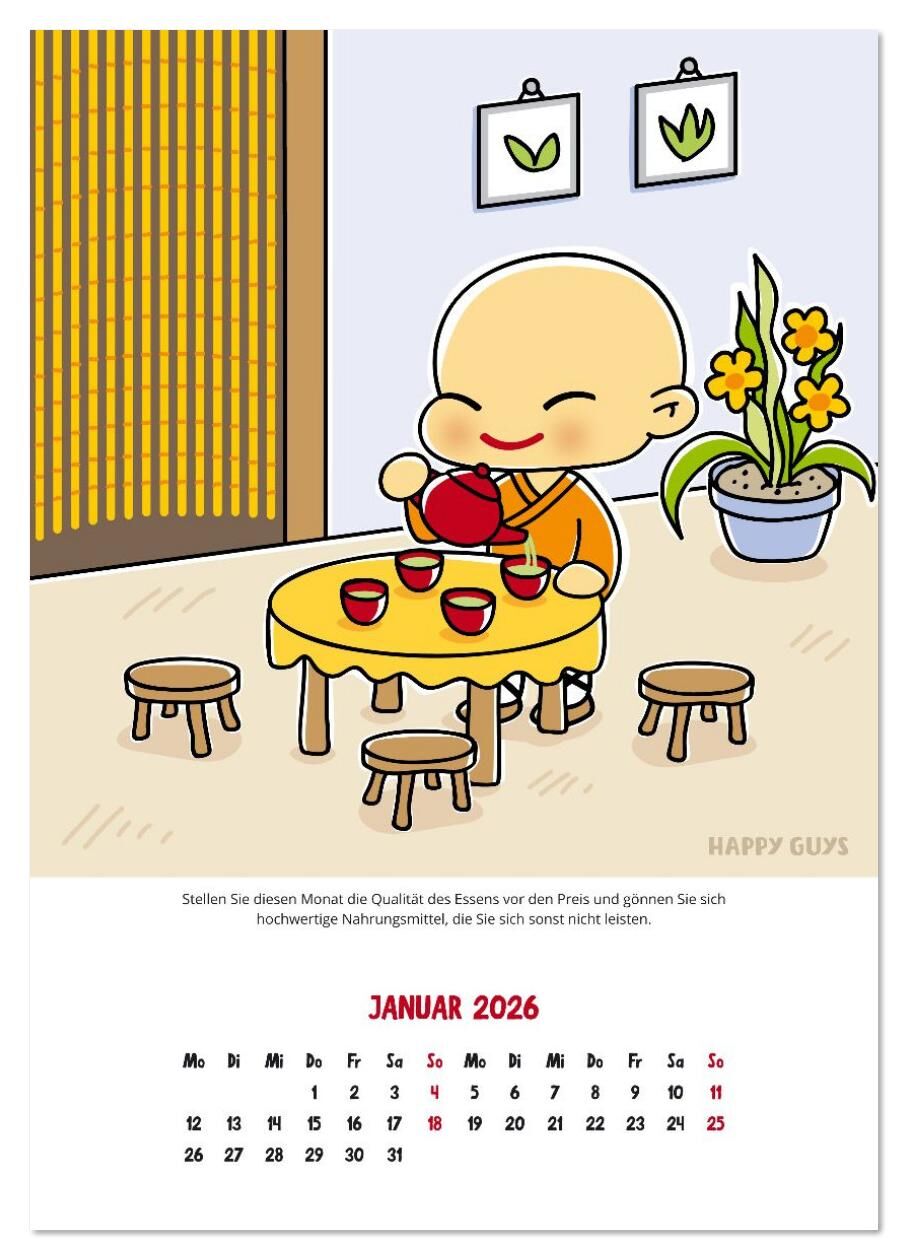 Wer achtsam lebt, hat mehr vom Leben! Unter diesem Motto steht der von Bestseller-Autor Bernhard Moestl (Shaolin) und der mehrfach ausgezeichneten Illustratorin Irene Nemeth gestaltete Happiness Kalender 2026. Jeden Monat hilft Ihnen der knuddelige Shaolin-Mön...
