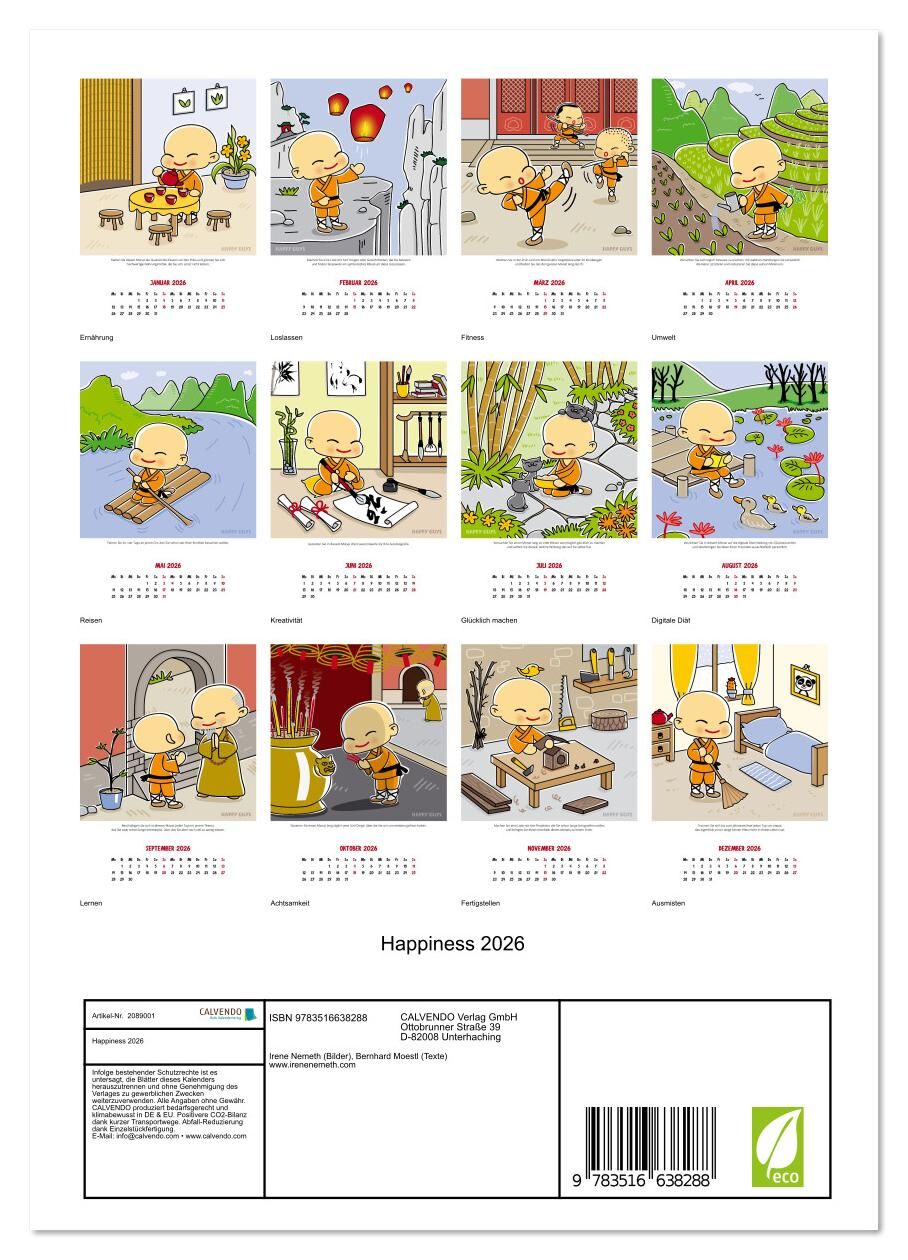 Wer achtsam lebt, hat mehr vom Leben! Unter diesem Motto steht der von Bestseller-Autor Bernhard Moestl (Shaolin) und der mehrfach ausgezeichneten Illustratorin Irene Nemeth gestaltete Happiness Kalender 2026. Jeden Monat hilft Ihnen der knuddelige Shaolin-Mön...