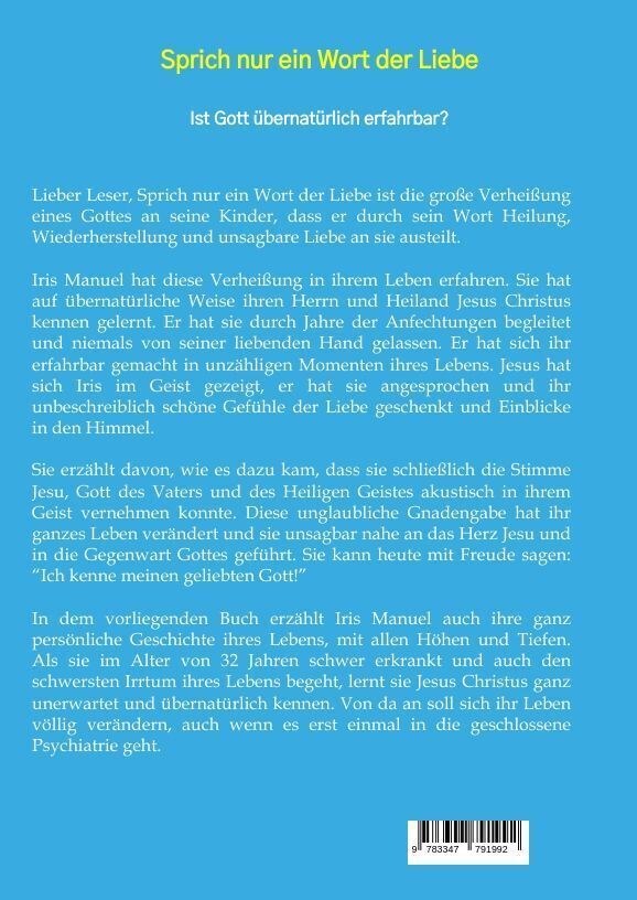 Ich erzähle in meiner Biografie wie ich Gott übernatürlich erlebt habe. Jesus Christus hat mich an seine Hand genommen und mir in einer Zeit, in der es sehr herausfordernd und schwer für mich war, seine Liebe und Güte gezeigt. Er hat mich seine Stimme im Geist...