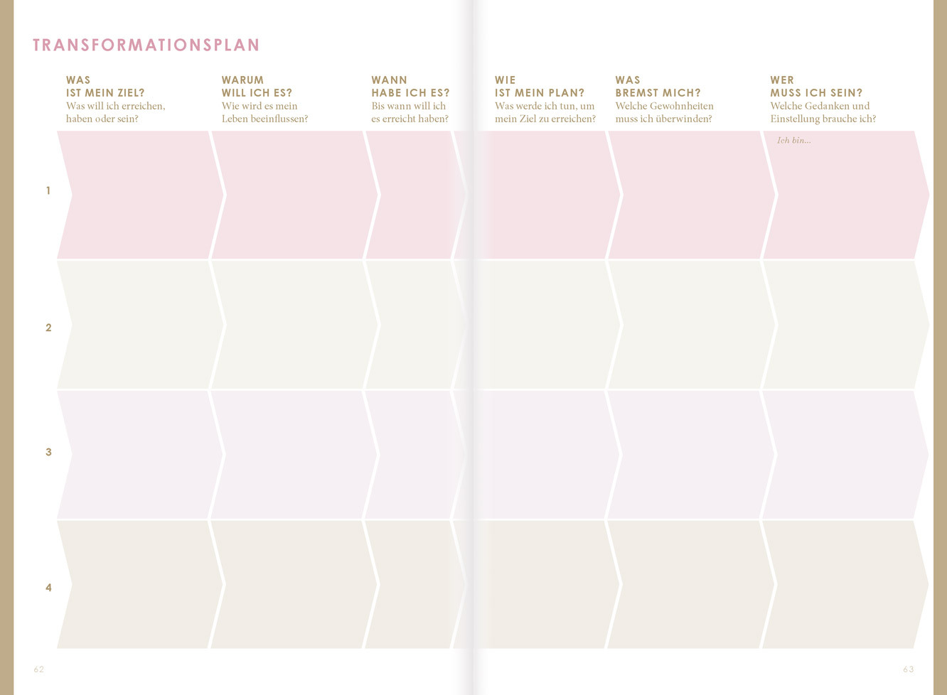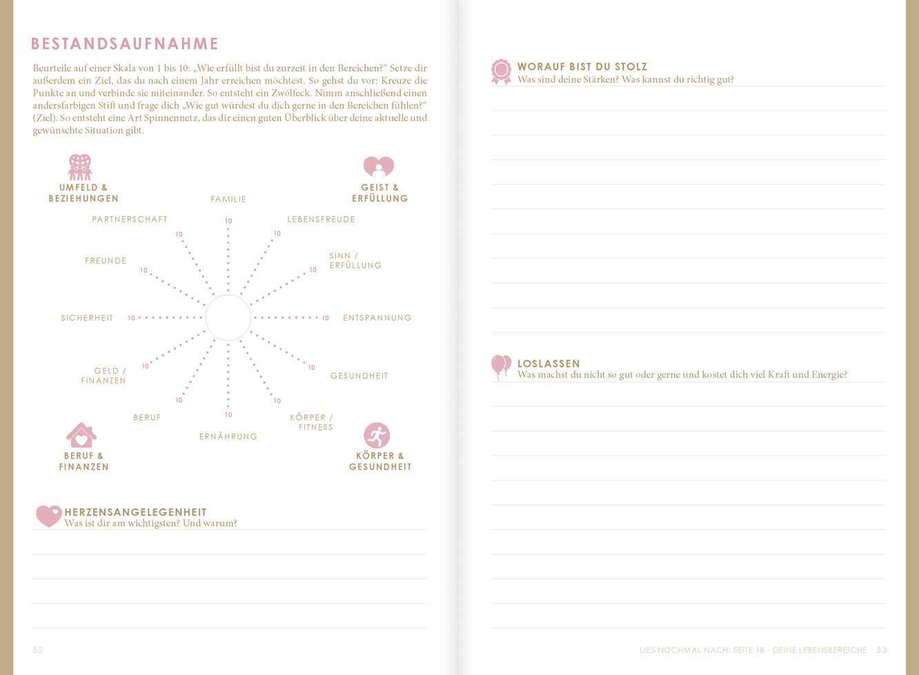 Inspirierende Fragen 48 Kreativ-Box 49 Deine Vision 50 Bestandsaufnahme 52 Limitierende Denkmuster 54 Positive Affirmationen 55 Happy Moments 56 Fokus-Rad …