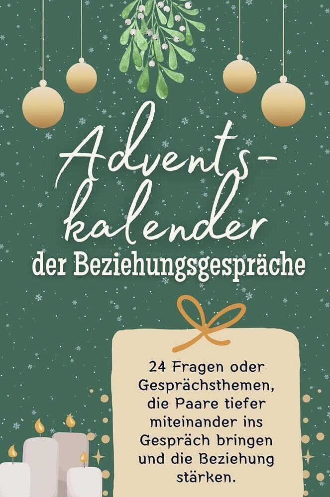 Wie wäre es, wenn ihr in diesem Advent eure Beziehung auf eine ganz neue Ebene hebt? Der "Adventskalender der Beziehungsgespräche" bietet euch 24 tiefgründige Fragen und Gesprächsthemen, die euch als Paar näher zusammenbringen und eure Verbindung stä...