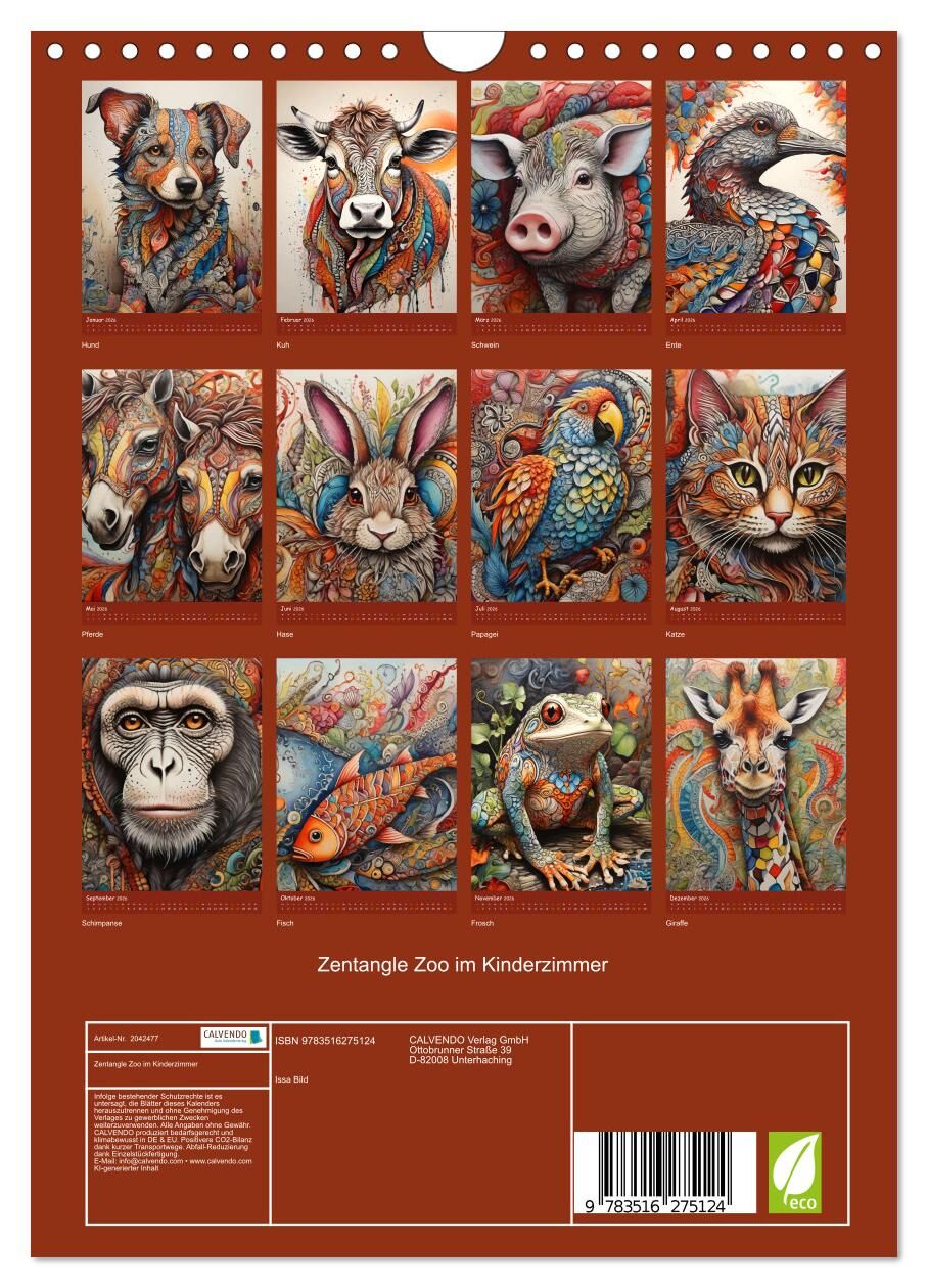 Entdecke eine fantasievolle Tierwelt mit diesem farbenfrohen Kalender für Kinder, gestaltet von einer KI. Haustiere und Wildtiere sind kunstvoll im Zentangle-Stil dargestellt, einer meditativen Kunstform mit sich wiederholenden Mustern zur Förderung von Kreati...