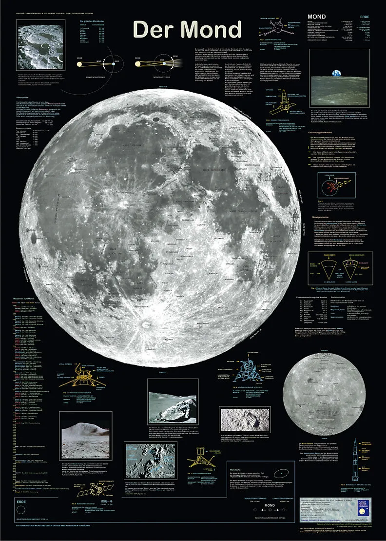 Das Poster zeigt den Erdmond, wie er sich den Astronauten darstellte. Neben einer detailliert beschrifteten Aufnahme der Mondvorderseite, wie sie mit jedem guten Fernrohr von der Erde aus beobachtet werden kann, werden auch die Rückseite und einige der schönst...