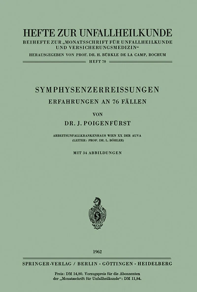 Allgemeiner Teil.- Verletztengut.- Anatomie und Funktion.- Entstehung der Symphysenzerreißung.- Bruchformen und Verschiebungen.- Mit- und Nebenverletzungen.- Erkennung der Symphysenzerreißung.- Röntgenuntersuchung.- Behandlung der Symphysenzerreißung.- Spezieller Teil.- Isolierte Symphysenzerreißungen.- Symphysenzerreißungen mit Sprengung der Kreuzdarmbeinfuge.- Symphysenzerreißungen mit vorderen Beckenringbrüchen.- Symphysenzerreißungen mit Pfannenbrüchen.- Symphysenzerreißungen mit Bruch der Darmbeinschaufel.- Symphysenzerreißungen mit Bruch des Kreuzbeinkörpers.- Symphysenzerreißungen mit dreifachen Beckenringbrüchen und Beckenzertrümmerungen.- Offene Symphysenzerreißungen.- Nicht frische Symphysenzerreißungen.- Weiterer Verlauf der konservativen Behandlung.- Nebenverletzungen der Extremitäten.- Nebenverletzungen der Wirbelsäule.- Nervenverletzungen.- Verletzungen der abführenden Harnwege und intraperitonealer Organe.- Störungen des Hei lungsverlaufes und Spätfolgen.- Todesfälle.- Anzeigestellung zur Operation.- Behandlungsergebnisse.- Nachuntersuchung.- Literatur.