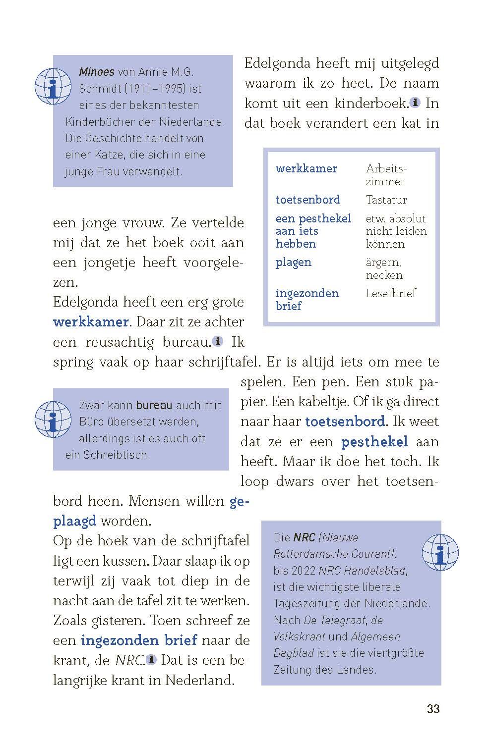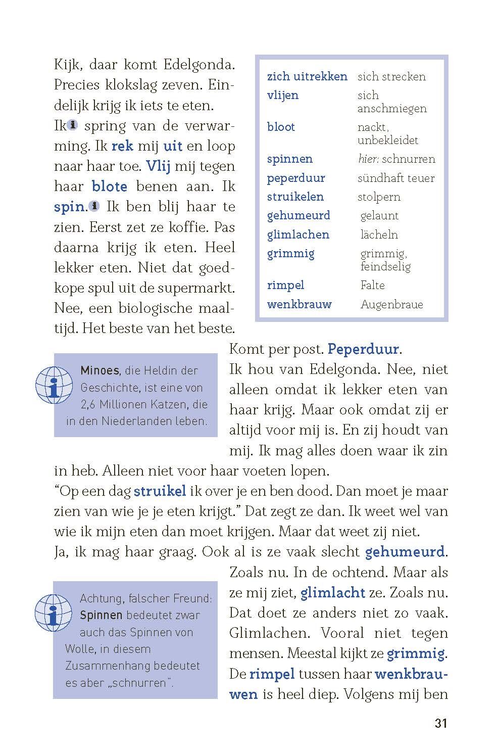 Junge Studenten, die ein vermeintlich wertvolles Schriftstück in Den Haag stehlen; Ein Gemeindezentrum in Amsterdam, das frischen Wind in die Nachbarschaft bringt; Ein unglückliches Treffen zweier Menschen, das sich am Ende doch als Glück herausstellt; Und ein...Junge Studenten, die ein vermeintlich wertvolles Schriftstück in Den Haag stehlen; Ein Gemeindezentrum in Amsterdam, das frischen Wind in die Nachbarschaft bringt; Ein unglückliches Treffen zweier Menschen, das sich am Ende doch als Glück herausstellt; Und eine streunende Katze, die zwei entfremdete Schwestern wieder zusammenbringt. Vier kurze, aber mitreißende Geschichten aus dem alltäglichen Leben, die den Leser mit einer unerwarteten Wendung bis zum Schluss begeistern. Die Reihe Kurzgeschichten folgt in Aufbau und Konzept der bewährten Reihe Lernkrimi. Die von Muttersprachlerinnen verfassten Geschichten mit textintegrierten Übungen, Vokabelkästen, Infokästen, Abschlusstest, Lösungen und Glossar spielen an landestypischen Schauplätzen in den Niederlanden. Für Anfänger mit ersten Grundkenntnissen, Sprachniveau A1+. Die Aussprache der Vokabeln kann man mit phase6 üben. • das erfolgreiche Lernkrimi-Konzept ohne kriminelle Handlung speziell für Anfänger mit ersten Vorkenntnissen, die in die niederländische Sprache eintauchen wollen • Vokabelkästen auf jeder Seite, Glossar, ausführliche Infokästen zu Sprache, Grammatik und Landeskunde • Selbstevaluierung durch Abschlussquiz • von didaktisch versierten Muttersprachlern verfasst und korrigiert • authentische, extra für das Buch verfasste Geschichten • Vokabeltraining inkl. Vertonung mit der phase6-App