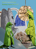 Pointed witches' hats with large buckles. A cowering figure in an emerald green satin dress peers furtively out of the dark. In front of her an erect figure in a rose-colored bodice, with garters, black patent leather gloves,and a feather boa. Both hold witche...