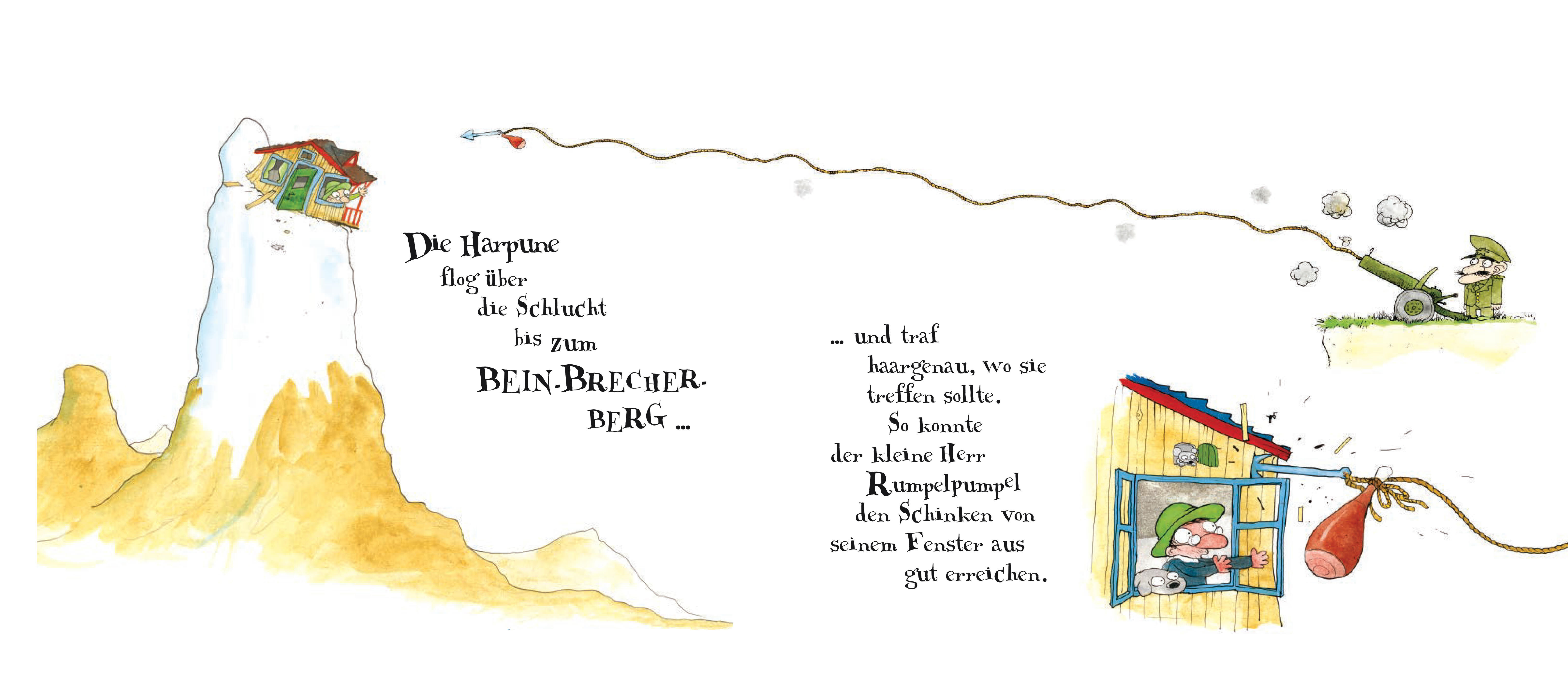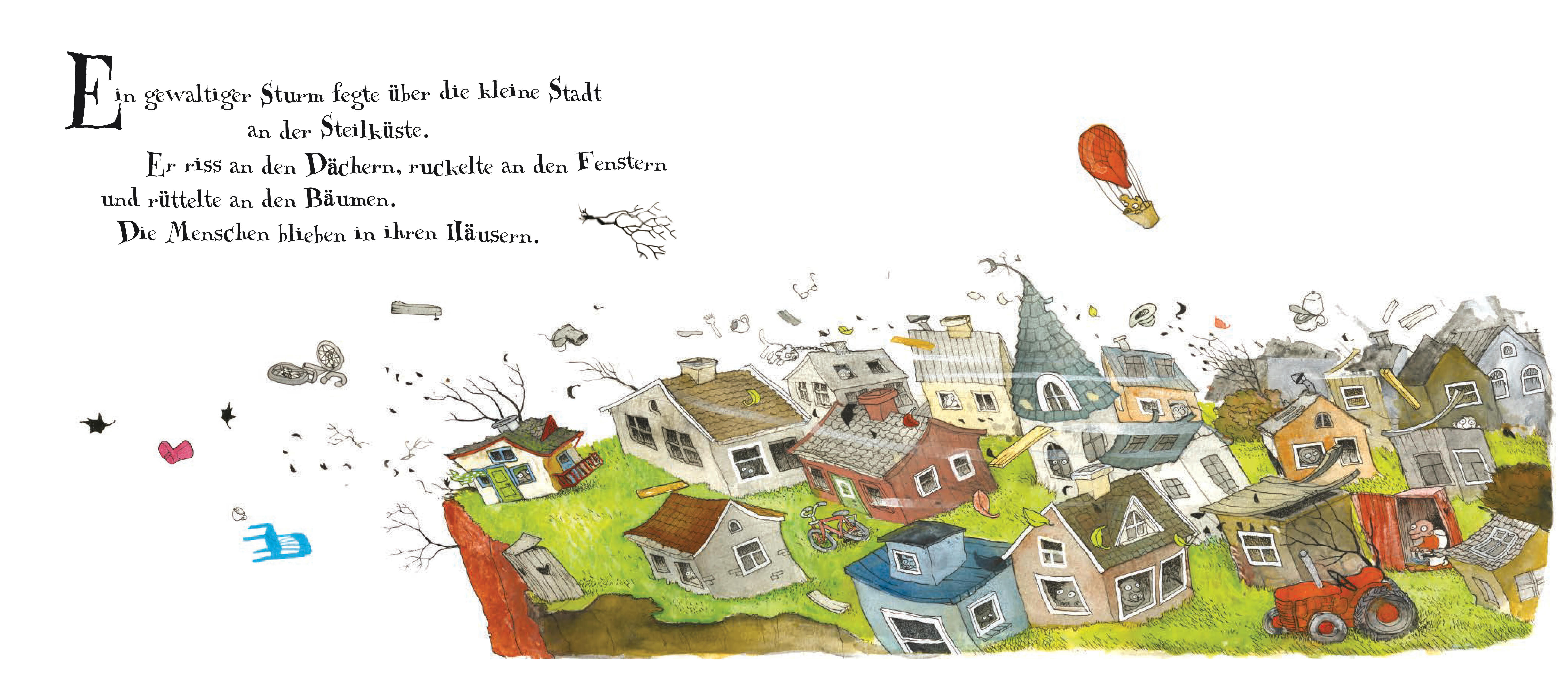 Ein Sturm fegt über die kleine Stadt an der Steilküste hinweg und lässt Bäume, Fahrräder und sogar Toiletten durch die Luft wirbeln. Am schlimmsten trifft es den kleinen Herrn Rumpelpumpel. Sein Haus wird vom Wind auf eine einsame Bergspitze getragen. Wie gut...