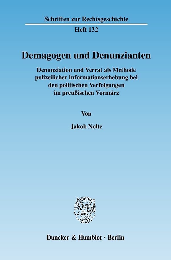 Die Kooperation mit staatlichen Verfolgungsbehörden durch Informationsübermittlung wird oft als Denunziation beschimpft. Denunziation ist letztlich vor allem durch die Erforschung der Gestapo und Aufarbeitung der Tätigkeit des MfS ins allgemeine Bewusstsein gerückt. Aber Denunziation ist kein ausschließliches Phänomen diktatorischer Regime des 20. Jahrhunderts. Die Anzeige strafbaren Verhaltens wird auch heute immer wieder von staatlicher Seite gefordert. Dennoch gibt es offensichtlich Unterschiede, je nachdem in welchem Kontext Denunziation stattfindet. Die Arbeit erforscht die rechtlichen und politischen Rahmenbedingungen, die Verwaltungstätigkeit und das Kooperationsverhalten der Bürger während der Demagogenverfolgung 1815 bis 1848 in Preußen. Die Demagogenverfolgung ist die erste politische Verfolgung modernen Stils in Deutschland. Erstmals wurde in Deutschland eine politische Polizei geschaffen. Man hat also den Eindruck, an den Ursprüngen der politischen Denunziation in Deutschland angekommen zu sein. Außerdem prägte die erste Hälfte des 19. Jahrhunderts die Entstehung des modernen Verwaltungsrechts. Institutionell kann in der preußischen politischen Polizei ein Vorgänger der späteren Gestapo gesehen werden, und das preußische Polizeirecht war der Ausgangspunkt der Entwicklung unseres heutigen Polizei- und Verwaltungsrechts. Die Arbeit widmet sich daher besonders der Funktion von Informationsbeschaffung beim Mitbürger im Verwaltungsrecht. Nach Vorüberlegungen zu Denunziation und Verrat als Gegenstand der Forschung stellt Jakob Nolte im ersten Teil der Arbeit die strukturellen Rahmenbedingungen dar. Anhand von Fallstudien werden im zweiten Teil exemplarisch typisches denunziatorisches Verhalten und dessen Wechselwirkung mit den institutionellen Rahmenbedingungen während der Demagogenverfolgung beschrieben.
