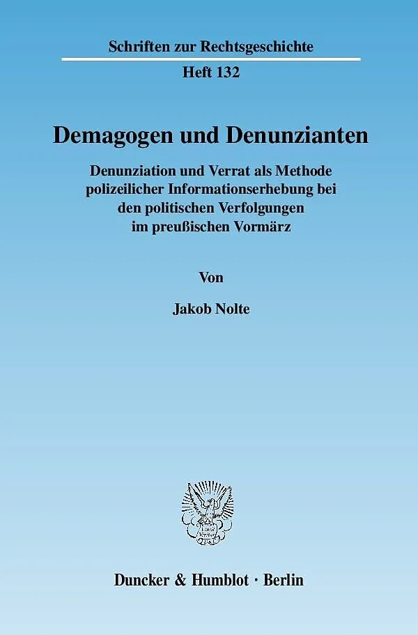 Die Kooperation mit staatlichen Verfolgungsbehörden durch Informationsübermittlung wird oft als Denunziation beschimpft. Denunziation ist letztlich vor allem durch die Erforschung der Gestapo und Aufarbeitung der Tätigkeit des MfS ins allgemeine Bewusstsein gerückt. Aber Denunziation ist kein ausschließliches Phänomen diktatorischer Regime des 20. Jahrhunderts. Die Anzeige strafbaren Verhaltens wird auch heute immer wieder von staatlicher Seite gefordert. Dennoch gibt es offensichtlich Unterschiede, je nachdem in welchem Kontext Denunziation stattfindet. Die Arbeit erforscht die rechtlichen und politischen Rahmenbedingungen, die Verwaltungstätigkeit und das Kooperationsverhalten der Bürger während der Demagogenverfolgung 1815 bis 1848 in Preußen. Die Demagogenverfolgung ist die erste politische Verfolgung modernen Stils in Deutschland. Erstmals wurde in Deutschland eine politische Polizei geschaffen. Man hat also den Eindruck, an den Ursprüngen der politischen Denunziation in Deutschland angekommen zu sein. Außerdem prägte die erste Hälfte des 19. Jahrhunderts die Entstehung des modernen Verwaltungsrechts. Institutionell kann in der preußischen politischen Polizei ein Vorgänger der späteren Gestapo gesehen werden, und das preußische Polizeirecht war der Ausgangspunkt der Entwicklung unseres heutigen Polizei- und Verwaltungsrechts. Die Arbeit widmet sich daher besonders der Funktion von Informationsbeschaffung beim Mitbürger im Verwaltungsrecht. Nach Vorüberlegungen zu Denunziation und Verrat als Gegenstand der Forschung stellt Jakob Nolte im ersten Teil der Arbeit die strukturellen Rahmenbedingungen dar. Anhand von Fallstudien werden im zweiten Teil exemplarisch typisches denunziatorisches Verhalten und dessen Wechselwirkung mit den institutionellen Rahmenbedingungen während der Demagogenverfolgung beschrieben.