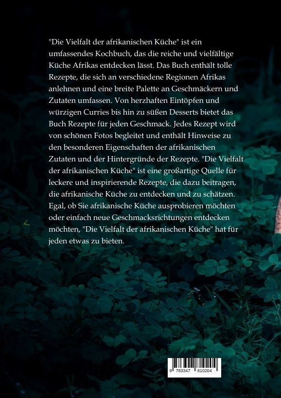 "Die Vielfalt der afrikanischen Küche" ist ein umfassendes Kochbuch, das die reiche und vielfältige Küche Afrikas entdecken lässt. Das Buch enthält tolle Rezepte, die sich an verschiedene Regionen Afrikas anlehnen und eine breite Palette an Geschmäckern und Zu...