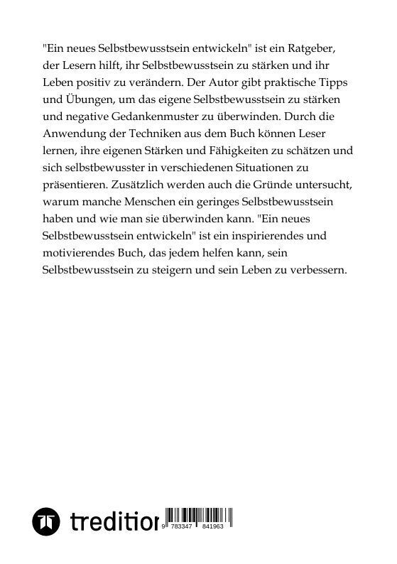 "Ein neues Selbstbewusstsein entwickeln" ist ein Ratgeber, der Lesern hilft, ihr Selbstbewusstsein zu stärken und ihr Leben positiv zu verändern. Der Autor gibt praktische Tipps und Übungen, um das eigene Selbstbewusstsein zu stärken und negative Gedankenmuste...