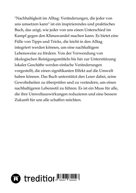 "Nachhaltigkeit im Alltag: Veränderungen, die jeder von uns umsetzen kann" ist ein inspirierendes und praktisches Buch, das zeigt, wie jeder von uns einen Unterschied im Kampf gegen den Klimawandel machen kann. Es bietet eine Fülle von Tipps und Tricks, die le...