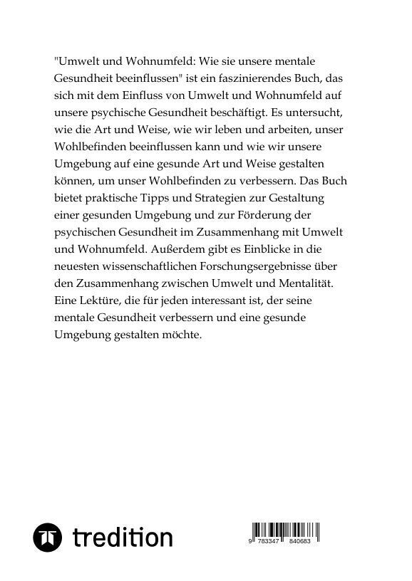 "Umwelt und Wohnumfeld: Wie sie unsere mentale Gesundheit beeinflussen" ist ein faszinierendes Buch, das sich mit dem Einfluss von Umwelt und Wohnumfeld auf unsere psychische Gesundheit beschäftigt. Es untersucht, wie die Art und Weise, wie wir leben und arbei...