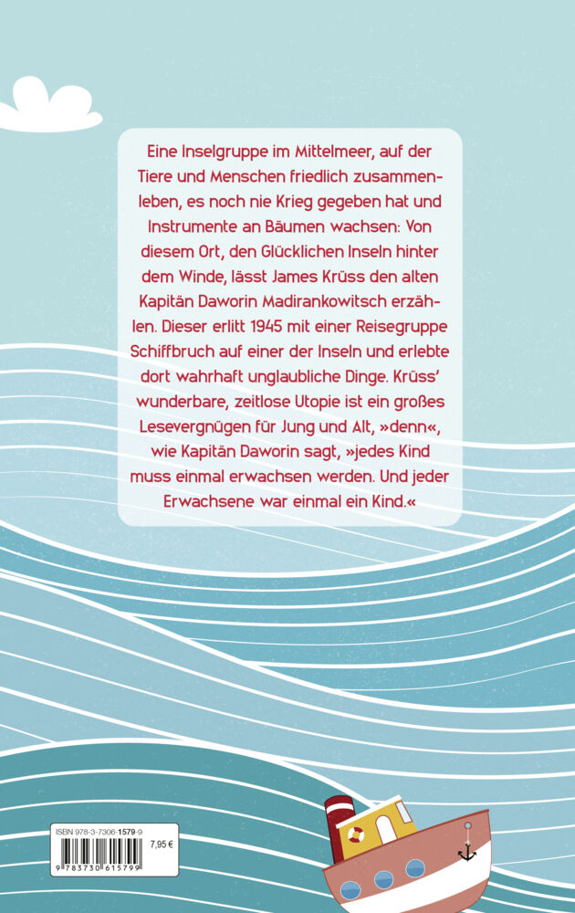 Eine Inselgruppe im Mittelmeer, auf der Tiere und Menschen friedlich zusammenleben, es noch nie Krieg gegeben hat und Instrumente an Bäumen wachsen: Von diesem Ort, den Glücklichen Inseln hinter dem Winde , lässt James Krüss den alten Kapitän Daworin Madiranko...