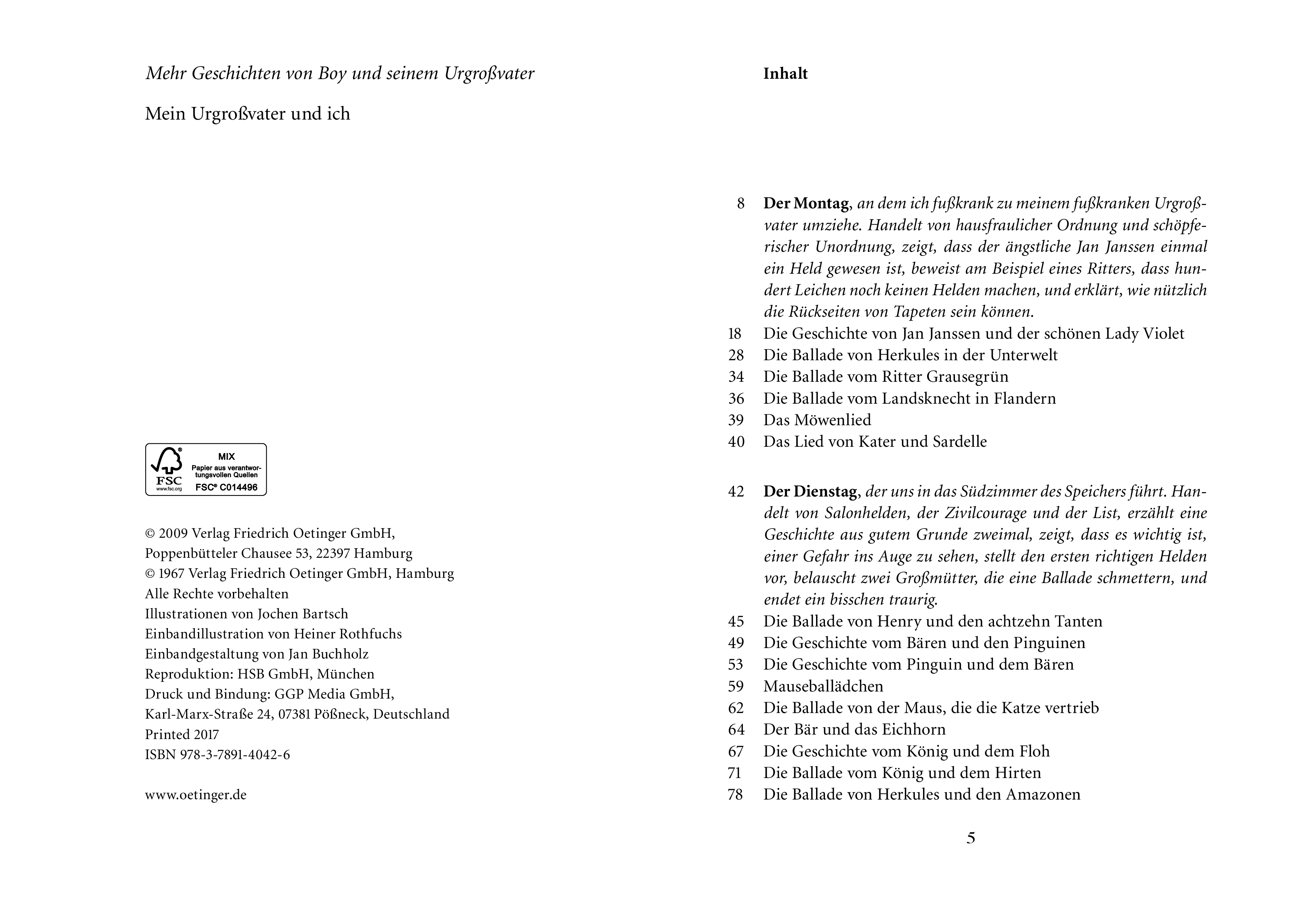 S. 8 Der Montag, an dem ich fußkrank zu meinem fußkranken Urgroßvater umziehe. Handelt von hausfraulicher Ordnung und schöpferischer Unordnung, zeigt, dass der ängstliche Jan Janssen einmal ein Held gewesen ist, beweist am Beispiel eines Ritters, dass hundert Leichen noch keinen Helden machen, und erklärt, wie nützlich die Rückseiten von Tapeten sein können.