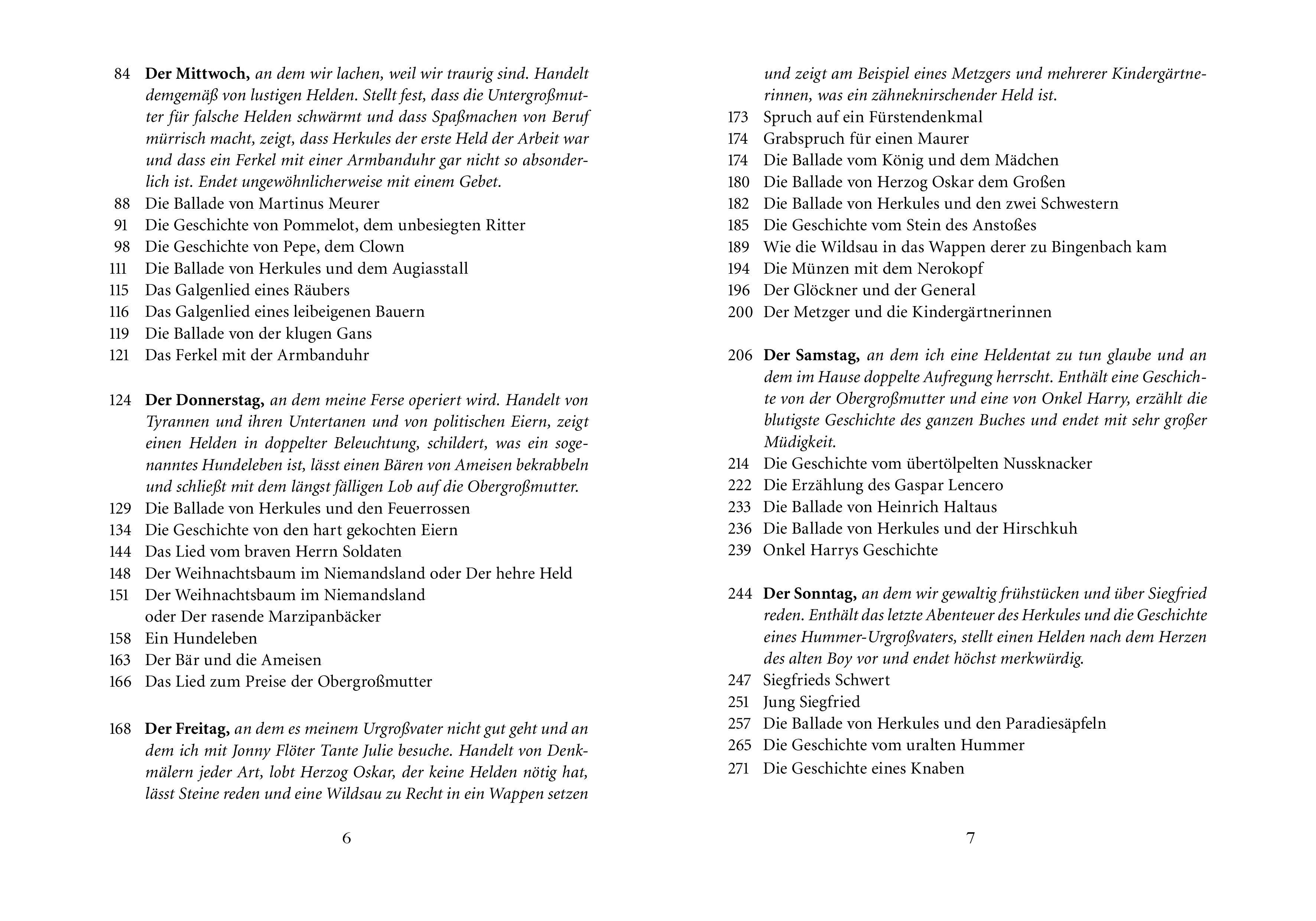 S. 168 Der Freitag , an dem es meinem Urgroßvater nicht gut geht und an dem ich mit Jonny Flöter Tante Julie besuche. Handelt von Denkmälern jeder Art, lobt Herzog Oskar, der keine Helden nötig hat, lässt Steine reden und eine Wildsau zu Recht in ein Wappen setzen und zeigt am Beispiel eines Metzgers und mehrerer Kindergärtnerinnen, was ein zähneknirschender Held ist.