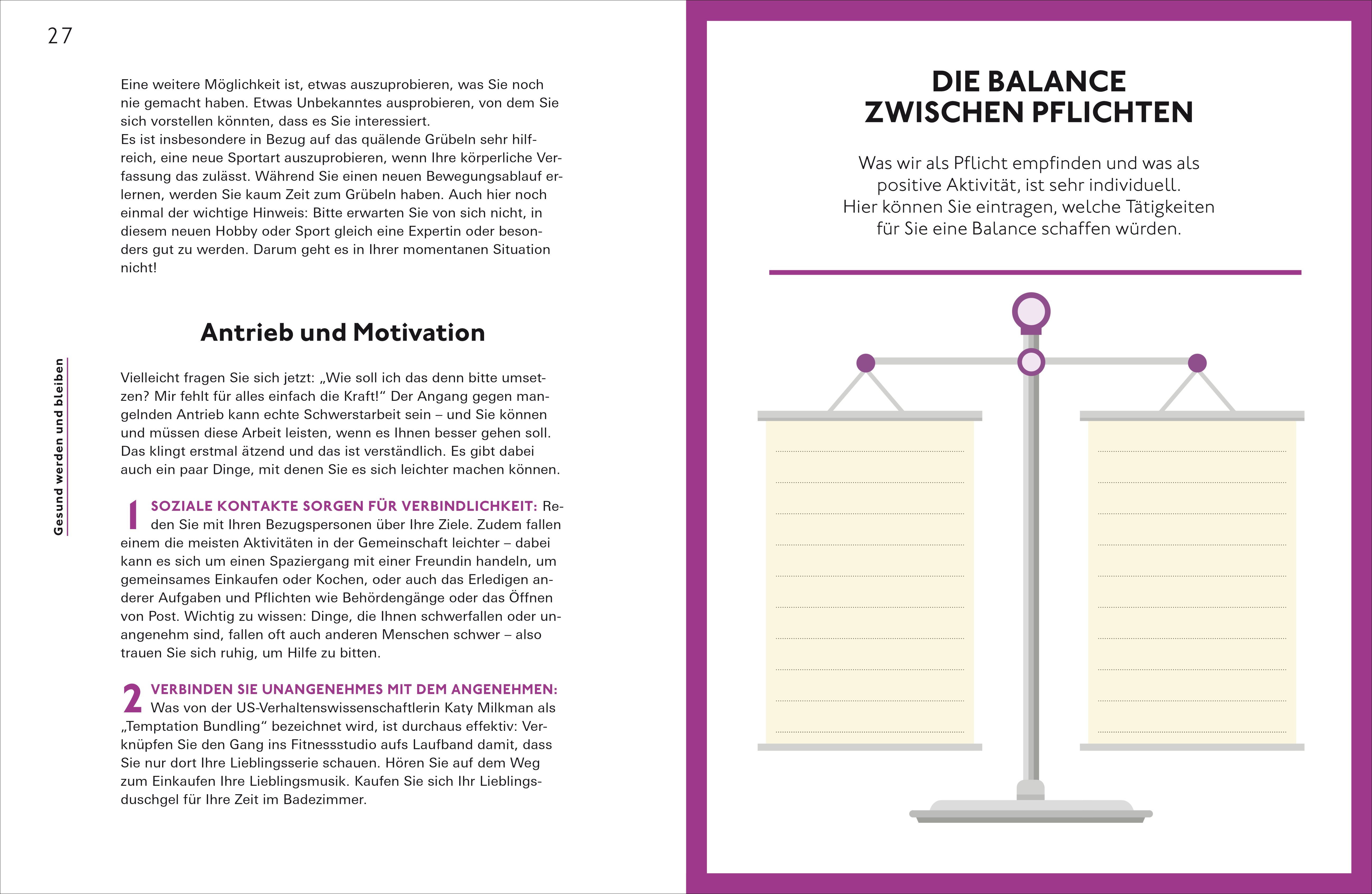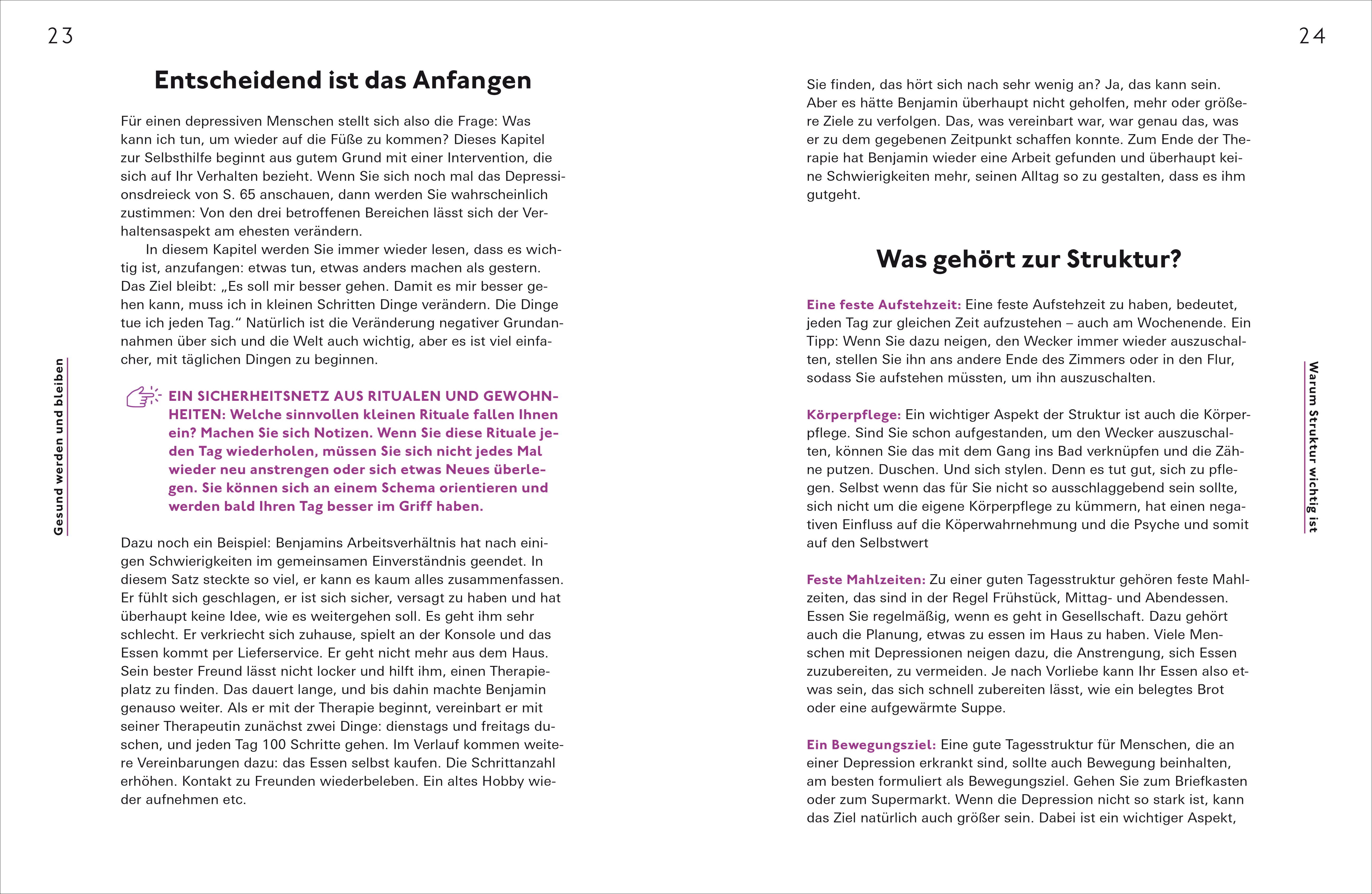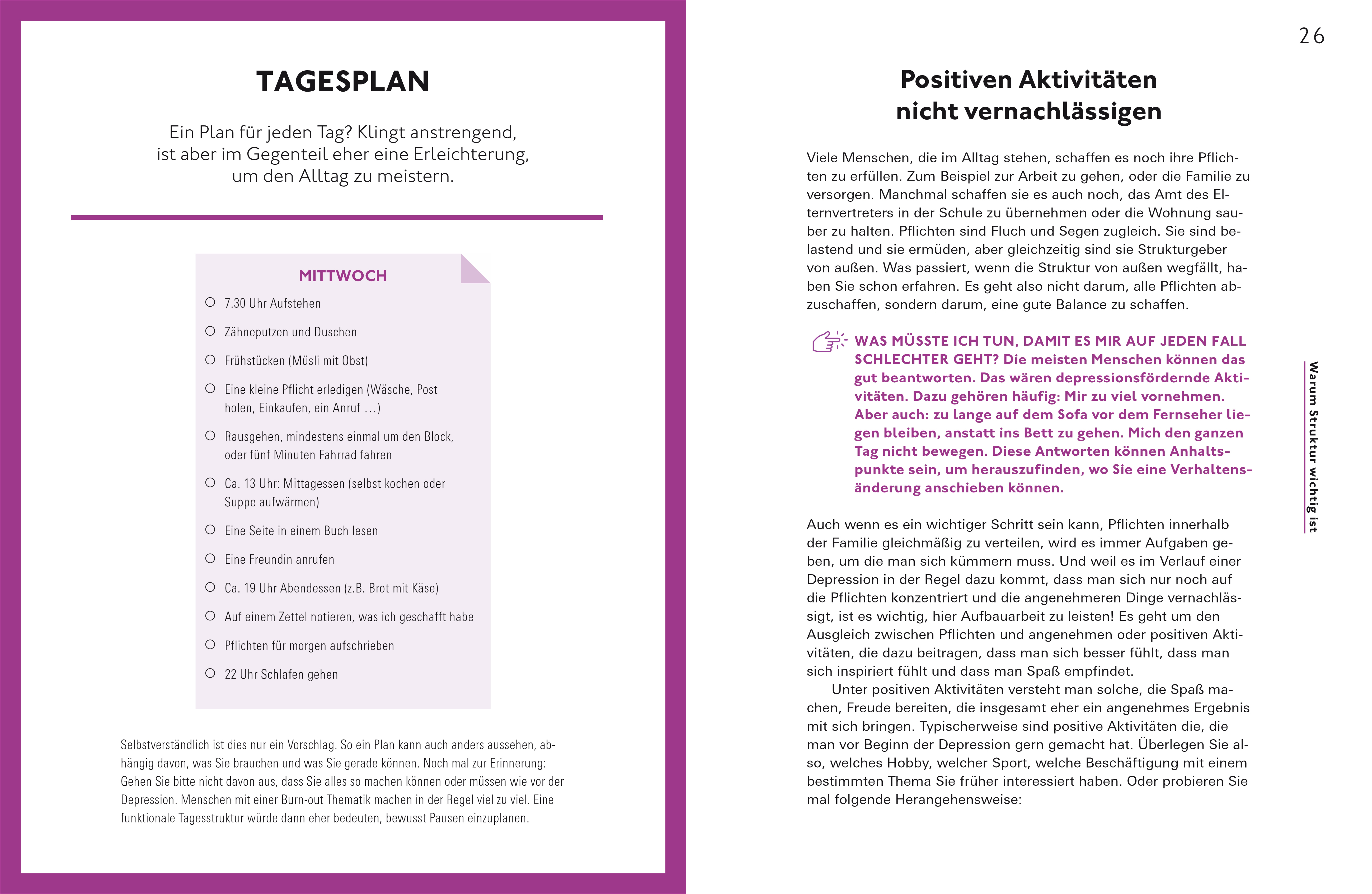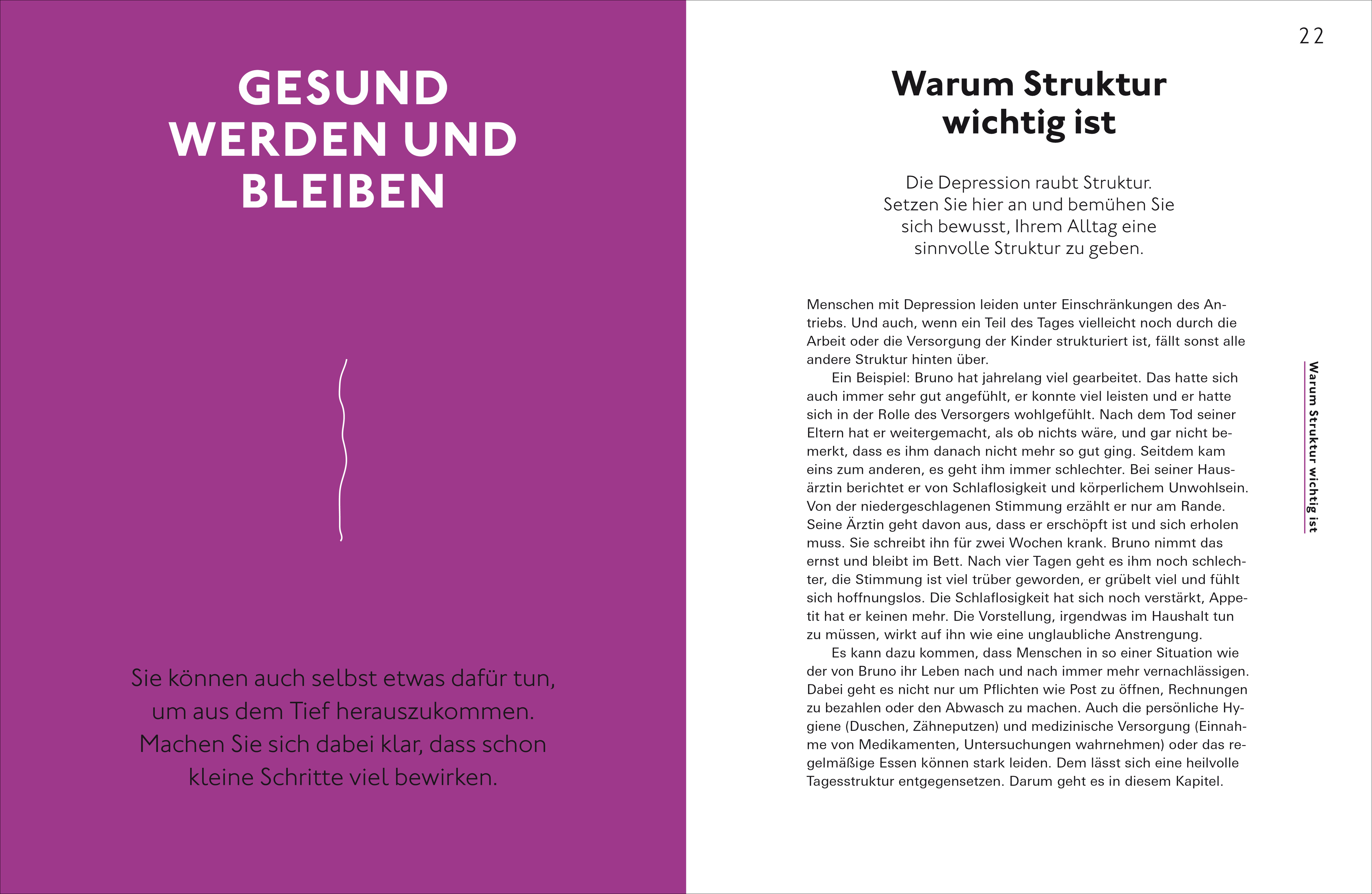 Lassen Sie sich nicht hängen! Jeder kleine Schritt bringt Sie auf Ihrem Weg raus aus der Depression weiter nach vorne. Geben Sie Ihrem Alltag Struktur und erlauben Sie sich Selbstfürsorge und Entspannung.