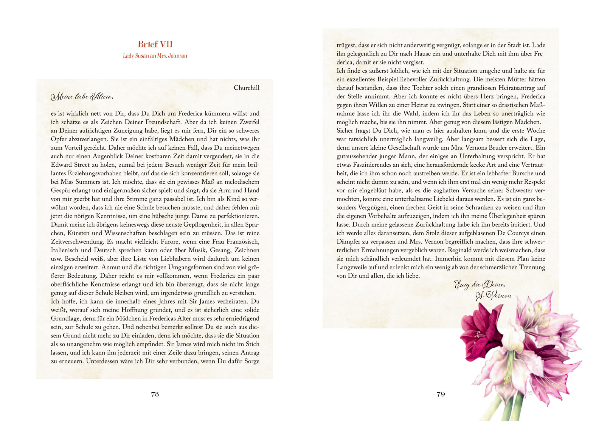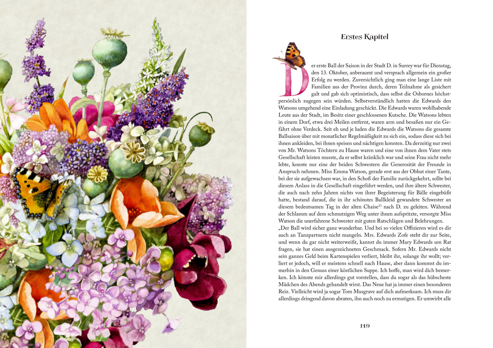 Ergänzt werden die Geschichten durch Jane Austens Jugendwerke , bestehend aus Bühnenstücken, Erzählungen und Ideen, die die Autorin bereits zwischen ihrem 11. und 17. Lebensjahr aufschrieb. Sie zeugen von großer Kreativität, Fantasie, Witz und dem Wunsch, ihre Leserschaft zu überraschen und zu provozieren. 5 aufwendig gestaltete Extras aus der Welt von Jane Austen und 5 lesenswerte Briefe vervollständigen den Band.