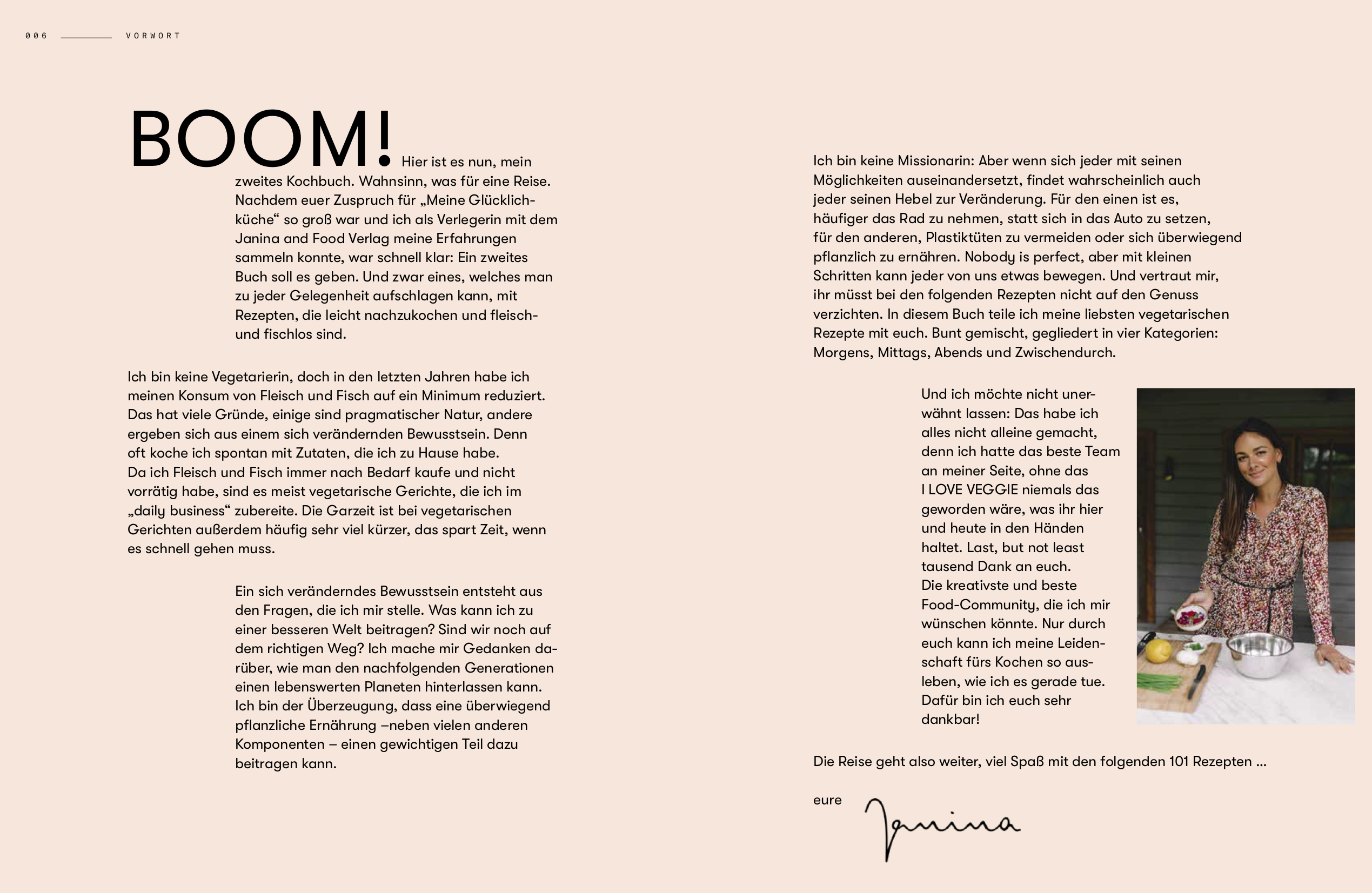 Boom! Hier ist es nun, mein zweites Kochbuch. Wahnsinn, was für eine Reise. Nachdem euer Zuspruch für Meine Glücklichküche so groß war und ich als Verlegerin mit dem Janina and Food Verlag meine Erfahrungen sammeln konnte, war schnell klar: Ein zweites Buch soll es geben. Und zwar eines, welches man zu jeder Gelegenheit aufschlagen kann, mit Rezepten, die leicht nachzukochen und fleisch- und fischlos sind. Ich bin keine Vegetarierin, doch in den letzten Jahren habe ich meinen Konsum von Fleisch und Fisch auf ein Minimum reduziert. Das hat viele Gründe, einige sind pragmatischer Natur, andere ergeben sich aus einem sich verändernden Bewusstsein. Denn oft koche ich spontan mit Zutaten, die ich zu Hause habe. Da ich Fleisch und Fisch immer nach Bedarf kaufe und nicht vorrätig habe, sind es meist vegetarische Gerichte, die ich im daily business zubereite. Die Garzeit ist bei vegetarischen Gerichten außerdem häufig sehr viel kürzer, das spart Zeit, wenn es schnell gehen muss. Ein sich veränderndes Bewusstsein entsteht aus den Fragen, die ich mir stelle. Was kann ich zu einer besseren Welt beitragen? Sind wir noch auf dem richtigen Weg? Ich mache mir Gedanken darüber, wie man den nachfolgenden Generationen einen lebenswerten Planeten hinterlassen kann. Ich bin der Überzeugung, dass eine überwiegend pflanzliche Ernährung neben vielen anderen Komponenten einen gewichtigen Teil dazu beitragen kann. Ich bin keine Missionarin: Aber wenn sich jeder mit seinen Möglichkeiten auseinandersetzt, findet wahrscheinlich auch jeder seinen Hebel zur Veränderung. Für den einen ist es, häufiger das Rad zu nehmen, statt sich in das Auto zu setzen, für den anderen, Plastiktüten zu vermeiden oder sich überwiegend pflanzlich zu ernähren. Nobody is perfect, aber mit kleinen Schritten kann jeder von uns etwas bewegen. Und vertraut mir, ihr müsst bei den folgenden Rezepten nicht auf den Genuss verzichten. In diesem Buch teile ich meine liebsten vegetarischen Rezepte mit euch. Bunt gemischt, gegliedert in vier Kategorien: Morgens, Mittags, Abends und Zwischendurch. Und ich möchte nicht unerwähnt lassen: Das habe ich alles nicht alleine gemacht, denn ich hatte das beste Team an meiner Seite, ohne das I LOVE VEGGIE niemals das geworden wäre, was ihr hier und heute in den Händen haltet. Last, but not least tausend Dank an euch. Die kreativste und beste Food-Community, die ich mir wünschen könnte. Nur durch euch kann ich meine Leidenschaft fürs Kochen so ausleben, wie ich es gerade tue. Dafür bin ich euch sehr dankbar! Die Reise geht also weiter, viel Spaß mit den folgenden 101 Rezepten eure Janina