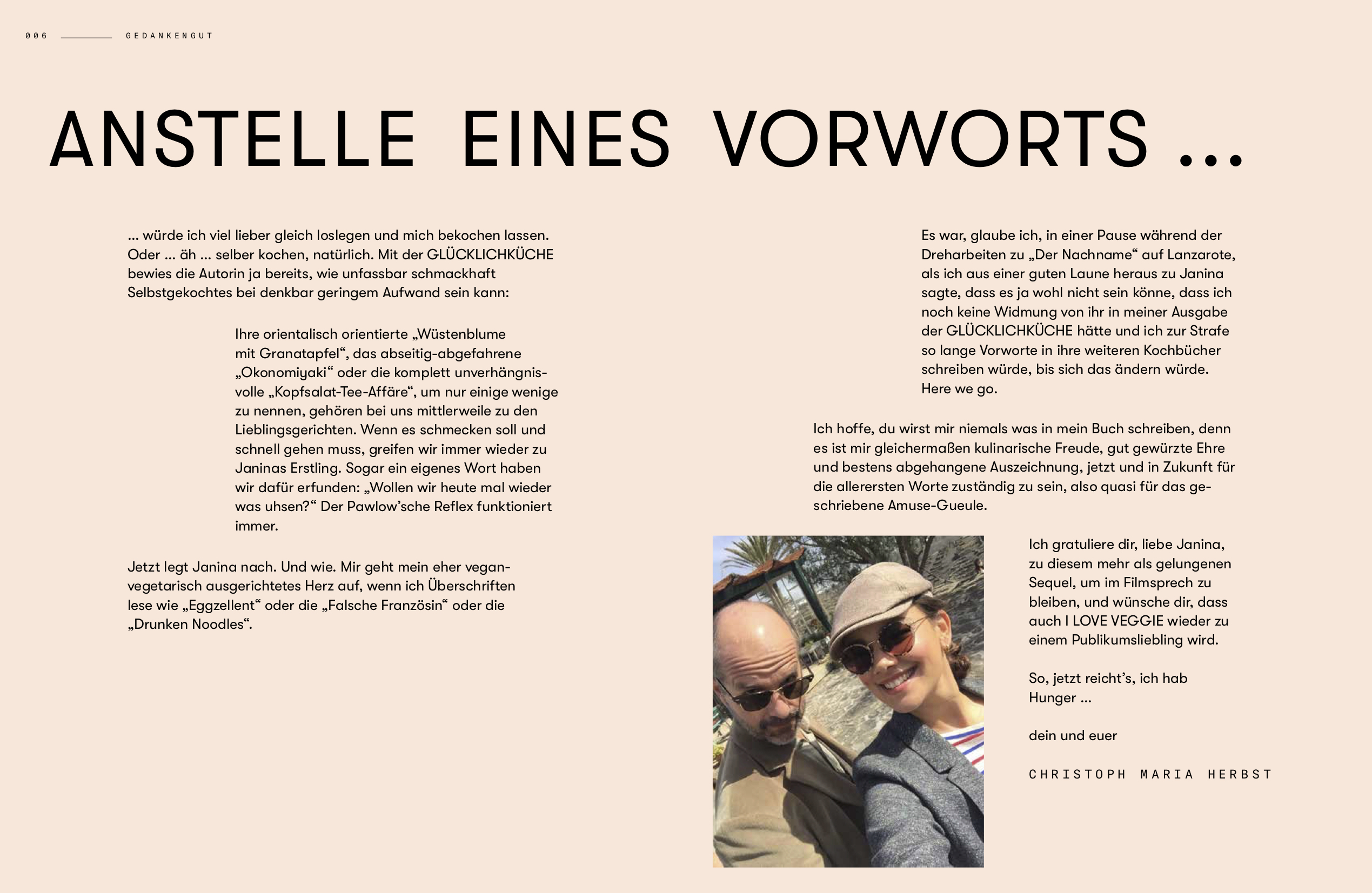 Janina Uhse, 31, ist eine deutsche Schauspielerin. Bekannt wurde Janina durch die Rolle der Jasmin Flemming in der RTL-Serie Gute Zeiten, schlechte Zeiten , in der sie seit Anfang 2008 zu sehen war. Ihren letzten Drehtag hatte sie am 12. Mai 2017. Seit Februar 2016 ist sie Markenbotschafterin der französischen Kosmetikmarke Lancôme. Seit März 2016 läuft ihr Projekt Janina and Food, bei dem sie jede Woche die besten Rezepte auf ihren Social-Media-Kanälen vorstellt. Dafür wurde sie zweimal von Axel Springer und Place To B als Influencerin des Jahres im Bereich Food ausgezeichnet. Im Jahr 2016 kam Janina mit Cro unsere Zeit ist jetzt , 2017 mit High Society und 2018 mit Der Vorname in die Kinos. Im selben Jahr lieh sie der Hauptfigur Mavis in dem US-Animationsfilm Hotel Transsilvanien 3 ihre Stimme. 2019 übernahm sie die Hauptrolle im Kinofilm Berlin. Berlin und mit Betonrausch die Hauptrolle im ersten deutschen Netflix-Film. 2020 folgte der Kinofilm Es ist zu deinem Besten und im Januar 2022 ist sie mit Der Nachname wieder in den Kinos zu sehen. Mit Meine Glücklichküche hat Janina Uhse 2019 erfolgreich ihr erstes Kochbuch veröffentlicht. Tim Gutke wurde 1977 in Hamburg geboren. Seine ersten Stücke wurden bei der Für Sie und der Hamburger Morgenpost veröffentlicht, bevor er 2002 für acht Jahre als Reporter zum Playboy nach München ging. Im Anschluss war er Textchef des internationalen Männermagazins L Officiel Hommes und arbeitete als Chefredakteur für den Medienkonzern Gruner & Jahr. Heute entwickelt er Marken und schreibt prämierte Texte u. a. für das SZ-Magazin , GQ , Abendblatt , Playboy und Robb Report und gehört zur Chefredaktion des Jahreszeiten Verlags. Sein erstes Buch war die irre Lebensgeschichte des Hochstaplers Mike Wappler alias Milliarden Mike . Er übernahm die mit Janina Uhse die Leitung des Janina and Food-Verlags und unterstützte sie bei ihrem Buchdebüt Meine Glücklichküche .