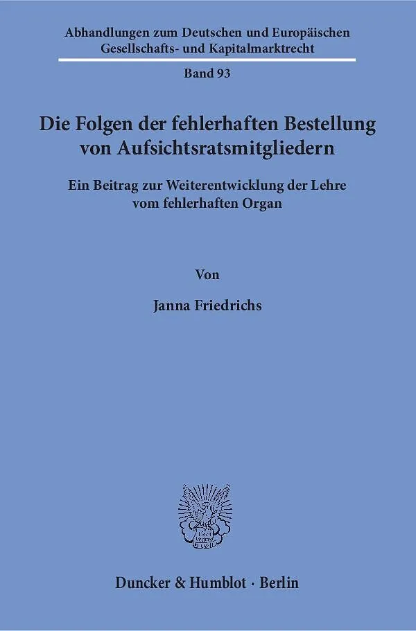 Das Bedürfnis für eine Vermeidung der aus der fehlerhaften Wahl von Aufsichtsratsmitgliedern resultierenden Rückabwicklungsschwierigkeiten ist groß, vor allem bei ihrer Mitwirkung an der Beschlussfassung. Die Autorin geht im Sinne einer Weiterentwicklung der L...