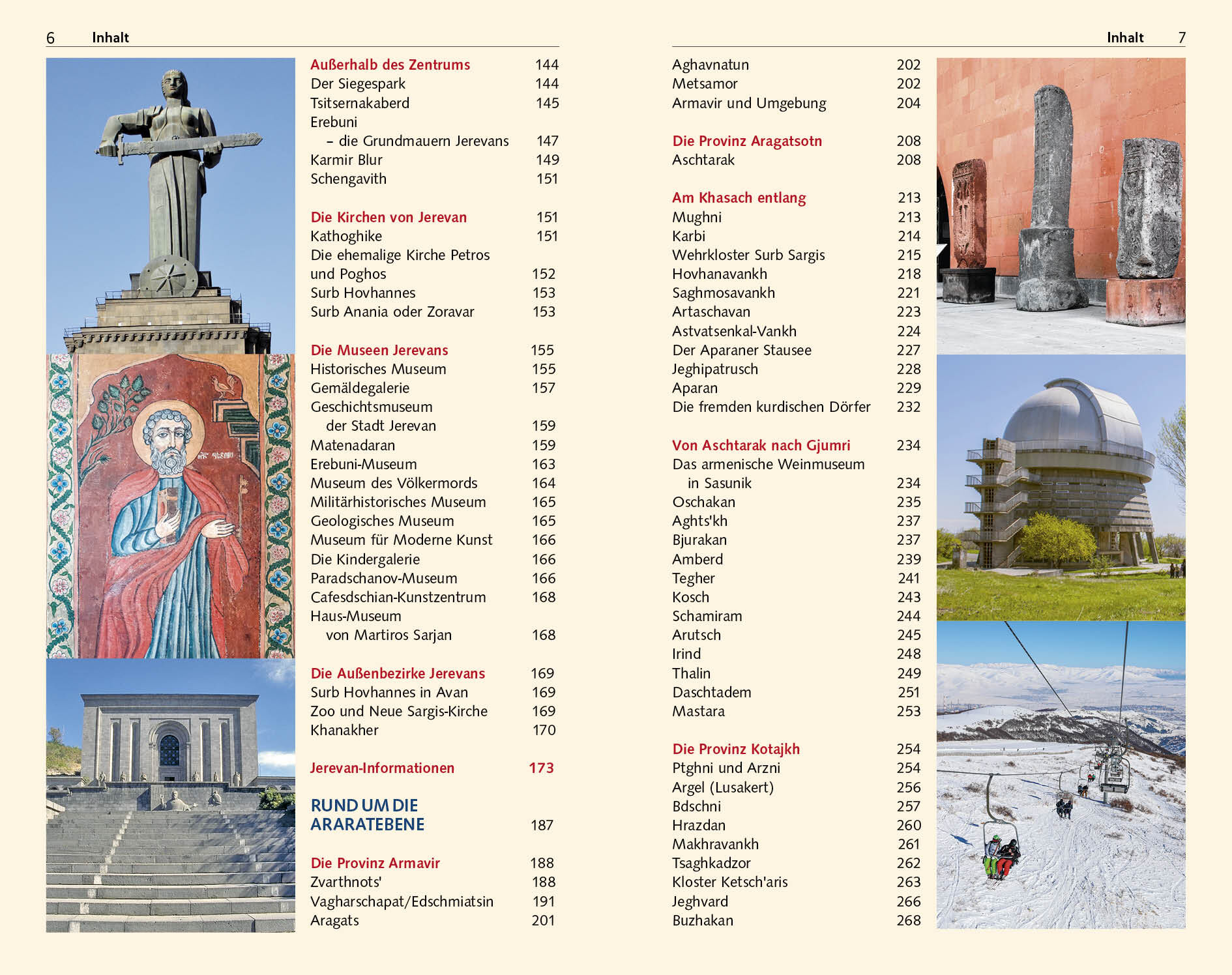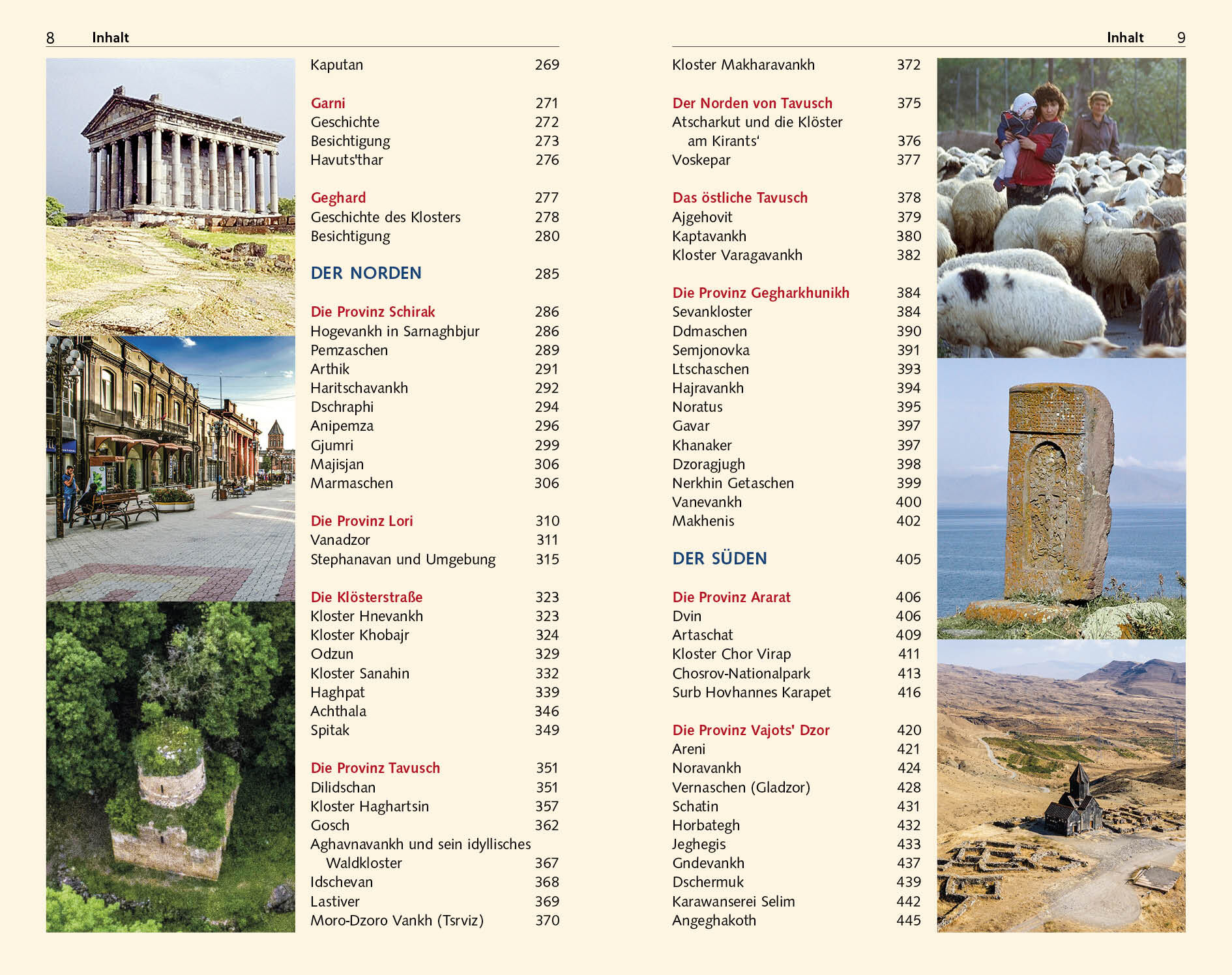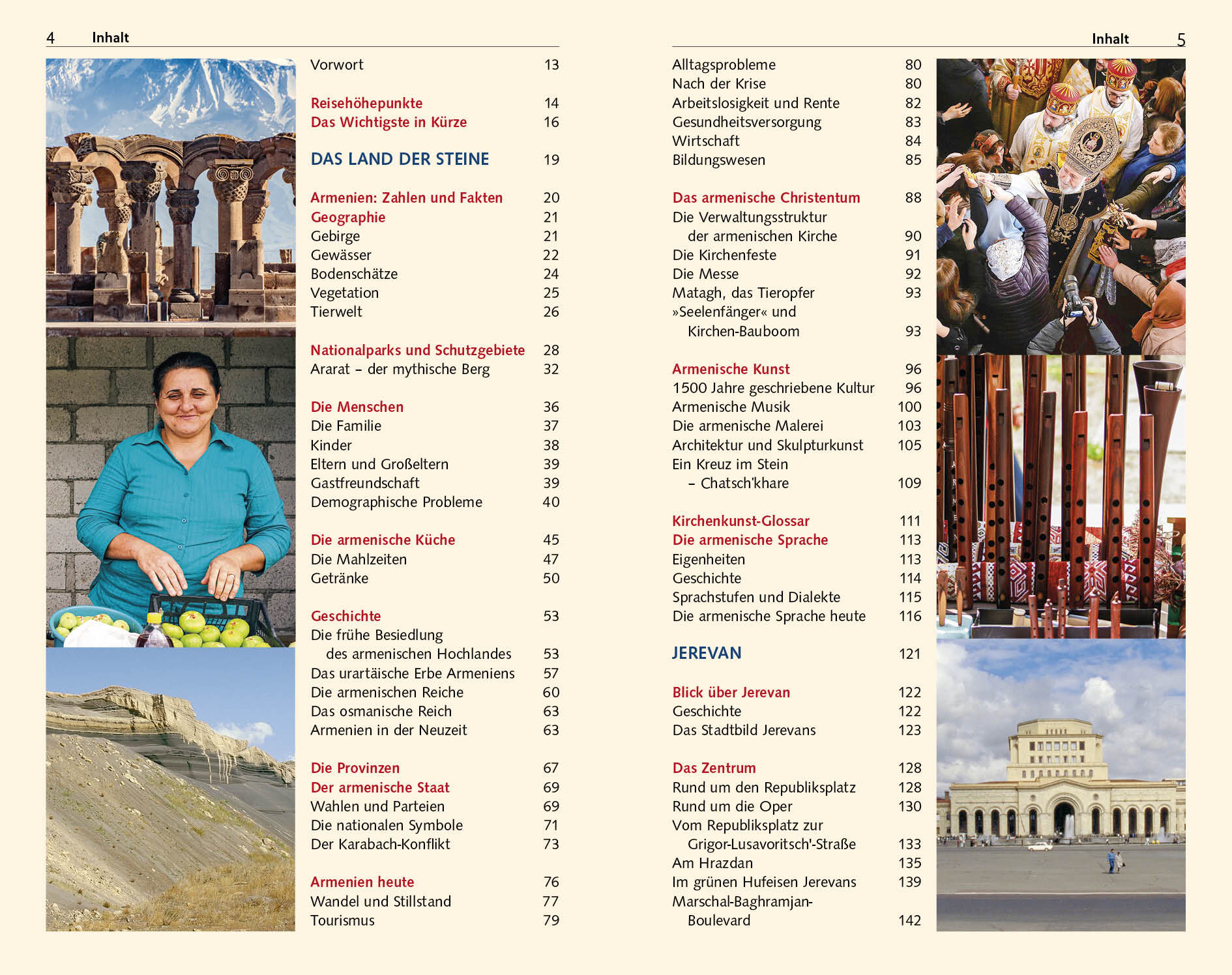 Vorwort 13 Reisehöhepunkte 14 Das Wichtigste in Kürze 16 DAS LAND DER STEINE 19 Armenien: Zahlen und Fakten 20 Geographie 21 Gebirge 21 Gewässer 22 Bodenschätze 24 Vegetation 25 Tierwelt 26 Nationalparks und Schutzgebiete 28 Ararat der mythische Berg 32 Die Menschen 36 Die Familie 37 Kinder 38 Eltern und Großeltern 39 Gastfreundschaft 39 Demographische Probleme 40 Die armenische Küche 45 Die Mahlzeiten 47 Getränke 50 Geschichte 53 Die frühe Besiedlung des armenischen Hochlandes 53 Das urartäische Erbe Armeniens 57 Die armenischen Reiche 60 Das osmanische Reich 63 Armenien in der Neuzeit 63 Die Provinzen 67 Der armenische Staat 69 Wahlen und …