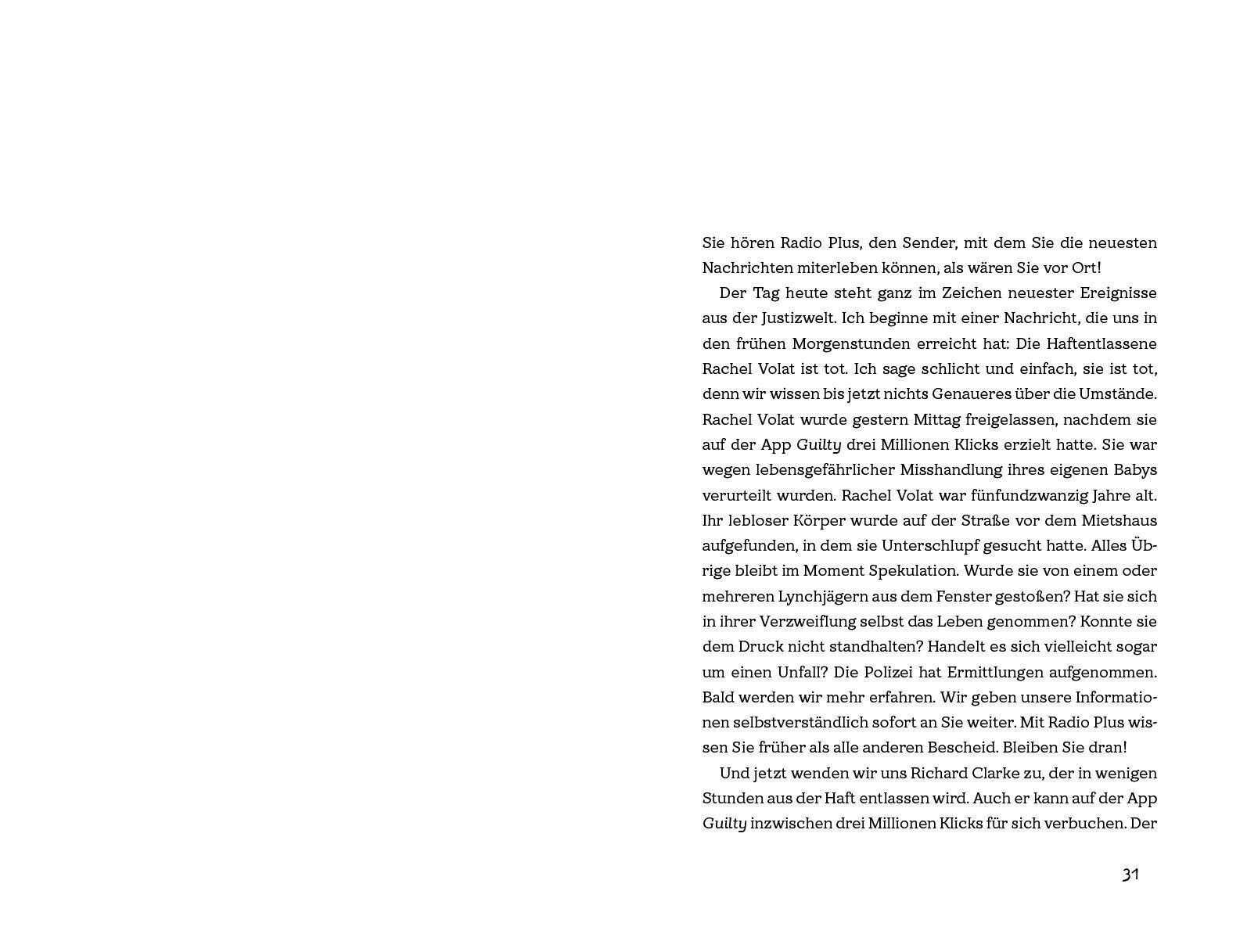 Aus dem Gefängnis gevotet: Jeder darf ihn jagen. Jeder darf ihn töten. Und jeder darf ihm helfen. Helena ist 21 und Aktivistin bei den Partisanen für mehr Volksgerechtigkeit. In einer Gesellschaft, die Lynchjustiz per App eingeführt hat, wendet sie sich gegen ...