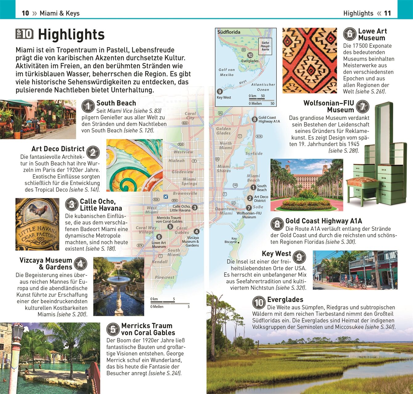 Klar strukturiert: Im bewährten TOP10-Prinzip werden die beliebtesten Sightseeing-Orte und Unternehmungen in Miami und der Umgebung kurz und knackig aufbereitet.