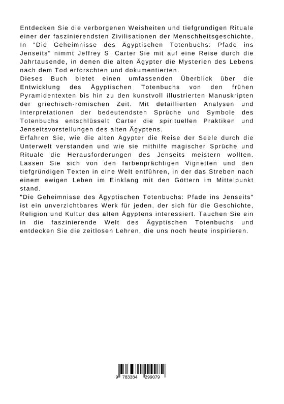 Entdecken Sie die verborgenen Weisheiten und tiefgründigen Rituale einer der faszinierendsten Zivilisationen der Menschheitsgeschichte. In "Die Geheimnisse des Ägyptischen Totenbuchs: Pfade ins Jenseits" nimmt Jeffrey S. Carter Sie mit auf eine Reise durch die...