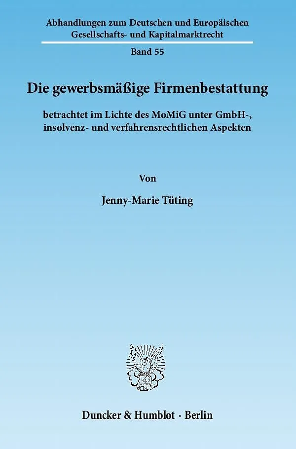 Jenny-Marie Tüting beschäftigt sich vorrangig mit der Frage, welche Maßnahmen das Phänomen der gewerbsmäßigen Firmenbestattung einzudämmen vermögen. Im Fokus liegt die Bewertung der zur Missbrauchsbekämpfung maßgeblichen Regelungen, die durch das Gesetz zur Modernisierung des GmbH-Rechts und zur Bekämpfung von Missbräuchen vom 23. Oktober 2008 (MoMiG) in Kraft getreten sind. Einem Überblick zum gesetzlich normierten Abwicklungssystem für die GmbH schließt sich die Begriffsbestimmung für den titelgebenden Terminus der gewerbsmäßigen Firmenbestattung an. Es folgt eine Darstellung gängiger Methoden, mit Hilfe derer die Firmenbestatter eine GmbH unter Umgehung der vorgesehenen Abwicklungsregelungen beseitigen. Die Autorin stellt bedeutsame Lösungsansätze vor, die die Rechtsprechung schon vor der GmbH-Reform zur Bekämpfung der gewerbsmäßigen Firmenbestattung praktiziert hat. Sodann untersucht sie die einschlägigen Neuregelungen des MoMiG hinsichtlich ihrer Eignung zur Missbrauchseindämmung. Hierbei bilden die Vorschriften zur vereinfachten Zustellung und Erreichbarkeit einer GmbH, zur ergänzenden Zuständigkeit und Verantwortung der Gesellschafter bei führungsloser GmbH, zur erweiterten Haftung für insolvenzverursachende Zahlungen und zu den verschärften Anforderungen an den GmbH-Geschäftsführer den Schwerpunkt des Diskurses. Tüting zieht als Resümee, dass die Regelungen des MoMiG einige Verbesserungen für die Bekämpfung gewerbsmäßiger Firmenbestattungen erwarten lassen insbesondere im Bereich der Erreichbarkeit einer GmbH sowie der Transparenz der Gesellschafter , durch sie allein indes das Problem noch nicht gelöst ist.
