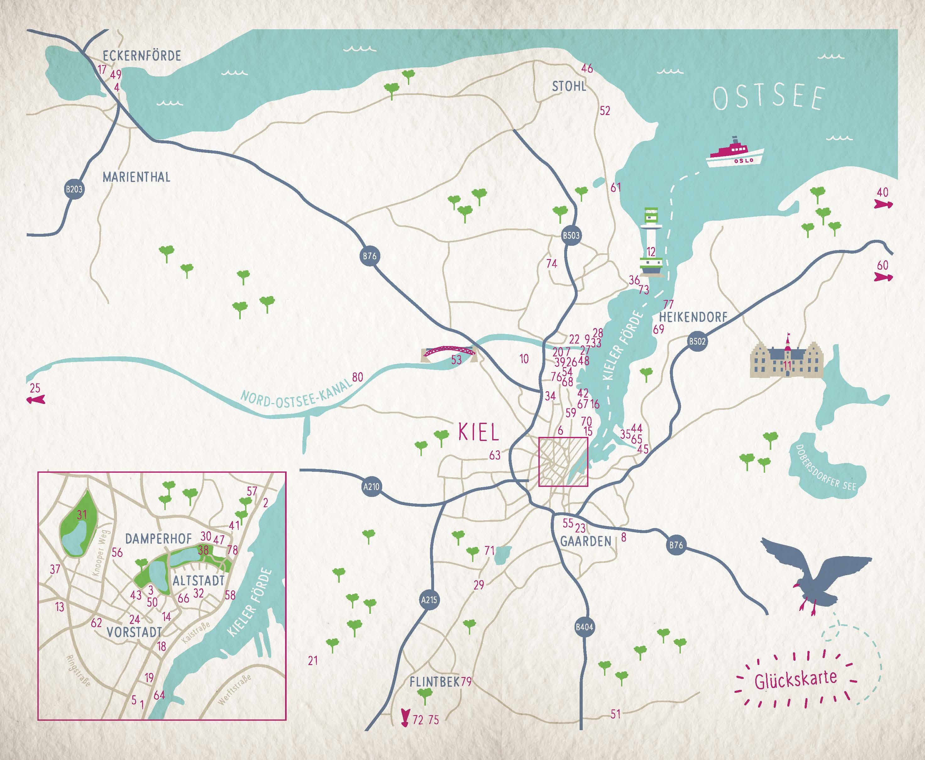 Schwebende Wale, rasante Reisen in den Sternenhimmel, Kreuzfahrten im Nahverkehr und lässiges Chillen in weißen Seebädern: Kiels Schatzkiste ist randvoll mit Glücksorten. Ob mitten in der Stadt oder an der Ostsee, ob idyllisch im Grünen oder mondän im Nachtleb...