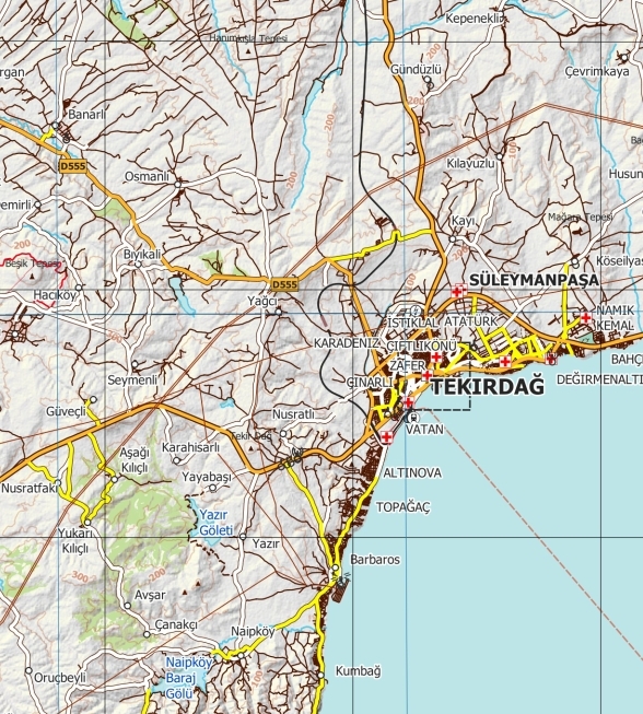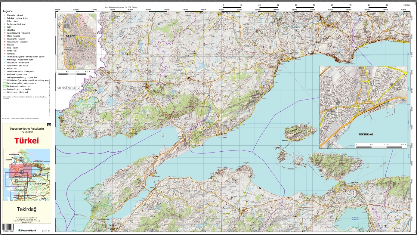 Detaillierte Topographische Landkarte der Türkei auf der Grundlage der OpenStreetmap. Enthält Wanderwege und Radwanderwege soweit in der Datenbasis vorhanden. Mit Innenstadtplan von Tekirda und Kean. HINWEIS: Bereiche außerhalb der Staatsgrenzen werden nicht d...