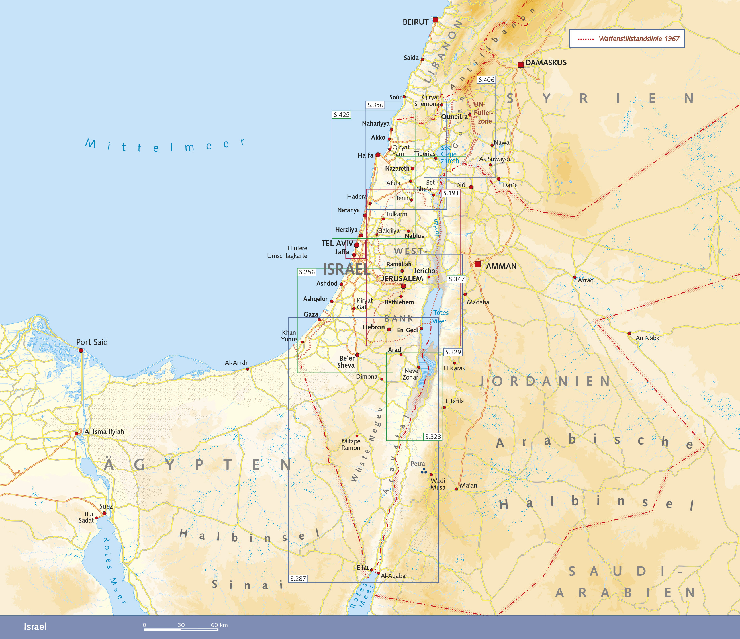 Vorwort 13 Reisehöhepunkte 14 Das Wichtigste in Kürze 16 Sicherheit 20 LÄNDER UND LEUTE 23 Naturräume 24 Küstenstreifen 24 Mittelgebirge 26 Jordangraben 27 Negev-Wüste 29 Golanhöhen und Hermon 29 Das Klima 30 Geschichte Israels und Palästinas 33 Frühgeschichte 33 Biblische Zeiten 33 Antike 38 Mittelalter 41 Neuzeit 45 20. Jahrhundert 47 Die Situation heute 69 Politik, Wirtschaft und Gesellschaft 70 Das politische System Israels 70 Israel und Palästina im Überblick 73 Die israelische Gesellschaft 74 Die arabischen Israelis 76 Die Drusen 78 Die Beduinen 79 Die israelische Wirtschaft 83 Die palästinensische Wirtschaft 86 Kulturleben 88 Literatur 88 Bildende Künste 89 Musik 91 Film 93 Das Sprachengewirr 94 Essen wie Gott im Orient 96 Speisen 97 Getränke 99 Kleines Speisenglossar 101 JERUSALEM 105 Zwischen Himmel und Hölle 106 Orientierung 108 Die Geschichte Jerusalems 109 Die Altstadt 121 Jaffator 121 Stadtmauern 123 Zitadelle und Davidsturm 124 Christliches Viertel 125 Muslimisches Viertel 129 Klagemauer 131 Jüdisches Viertel 137 Armenisches Viertel 139 Zionstor und Zionsberg 141 Ostjerusalem 145 Nördlich der Stadtmauer 145 Ölberg 145 Westjerusalem 153 Östliche Jaffa Road 156 Westliche Jaffa Road 160 Südlich der Jaffa Street 161 King David Street 163 Regierungsviertel Givat Ram 165 Herzlberg 168 Jerusalem-Informationen 171 DIE WESTBANK 181 Durch besetztes Territorium 182 Reisen in der Westbank 183 Geschichte und Gegenwart der Westbank 186 Südliche Westbank 190 Bethlehem 190 Bethlehem-Informationen 200 Theodosiuskloster und Mar Saba 203 Herodium 204 Hebron Al-Khalil 205 Nördliche Westbank 217 Abu Dis 217 Ramallah 218 Umgebung von Ramallah 227 Nablus 231 Samaria Sebastia 241 Qalqiliya 241 Jenin 247 Umgebung von Jenin 253 ZENTRALISRAEL UND DIE SÜDLICHE MITTELMEERKÜSTE 255 Von Jerusalem nach Westen 256 Abu Gosh 257 Tal von Latrun 258 Tal von Elah 261 Gush Etzion 262 Nationaler Archäologiepark Bet Guvrin 264 Lod und Ramla 264 Entlang der Südküste 271 Ashdod 271 Nizzan 273 Ashqelon 274 Yad Mordechai 277 Sderot und Umgebung 281 NEGEV UND ROTES MEER 285 Die Wüste Negev 286 Rahat 286 Be'er Sheva 289 Nationaler Archäologiepark Tel Arad 293 Arad 294 Dimona 295 Weltkulturerbe Mamshit-Nationalpark 297 Makhtesh HaGadol 300 Westlich des Highway 40 300 Mitzpe Ramon 305 Makhtesh Ramon 308 Der südliche Negev 309 Das Rote Meer 313 Eilat 315 Grenzübertritt nach Ägypten 320 Ausflug nach Jordanien 321 Petra 321 TOTES MEER UND JORDANTAL 325 Durch das Aravatal zum Toten Meer 326 Baraq Canyon 327 Dead Sea Works 327 Sodom 327 En Boqeq 332 Weltkulturerbe Festung 332 Masada 332 En Gedi 339 Enot Tsukim Nature Reserve 341 Qumran 342 Jericho und das untere Jordantal 345 Mosesgrab Nabi Musa 345 Jericho 345 Durch das Jordantal nach Galiläa 353 GALILÄA 355 Durch das Jordantal nach Norden 356 Bet She'an 357 Umgebung von Bet She'an 358 Festung Belvoir 360 Gesher 360 Der See Genezareth 362 Degania Alef 363 Yardenit 366 Tiberias 366 Von Tiberias nach Kapernaum 370 Das Hulatal 372 Safed Zefat 372 Rosh Pinna 378 Weltkulturerbe Tel Hazor 379 Hula Nature Reserve 379 Galiläischer Pfannenstiel 380 Obergaliläa 386 Jish 386 Mount Meron 386 Museum des Deutschsprachigen Judentums Tefen 387 Burgen und Höhlen 388 Niedergaliläa 390 Nördlich von Nazareth 390 Nazareth 391 Mount Tabor 400 Kafar Kama 400 Weltkulturerbe Beit She'arim 401 Waldheim Allonei Abba 402 Weltkulturerbe Tel Megiddo 403 Die Golanhöhen 405 Östlich des Sees Genezareth 410 Qatsrin 414 Auf dem Highway 98 nach Norden 415 Majdal Shams 418 Mount Hermon 420 Burg Nimrod 420 DIE NÖRDLICHE MITTELMEERKÜSTE 423 Von Herzliya nach Norden 424 Herzliya 424 Netanya 428 Nationaler Archäologiepark Caesarea 430 Caesarea-Stadt 432 Jisr Az-Zarqa 433 Zikhron Ya'aqov und Umgebung 434 Das Karmelgebirge 437 Weltkulturerbe Nahal Mearot Nature Reserve 438 Atlit 438 En Hod 441 Haifa 443 Geschichte 443 Haifa heute 446 Weltkulturerbe Bahai Gardens 447 Die Deutsche Kolonie 450 Sehenswürdigkeiten 451 Museen 453 Weltkulturerbe Akko 458 Geschichte 458 Sehenswürdigkeiten 460 Von Akko zur libanesischen Grenze 465 TEL AVIV UND JAFFA 469 Die bunte weiße Stadt 470 Orientierung 475 Rabin Square 475 Azrieli Observatory 476 Sarona 477 Dizengoff Street 477 Rothschild Boulevard 478 M…
